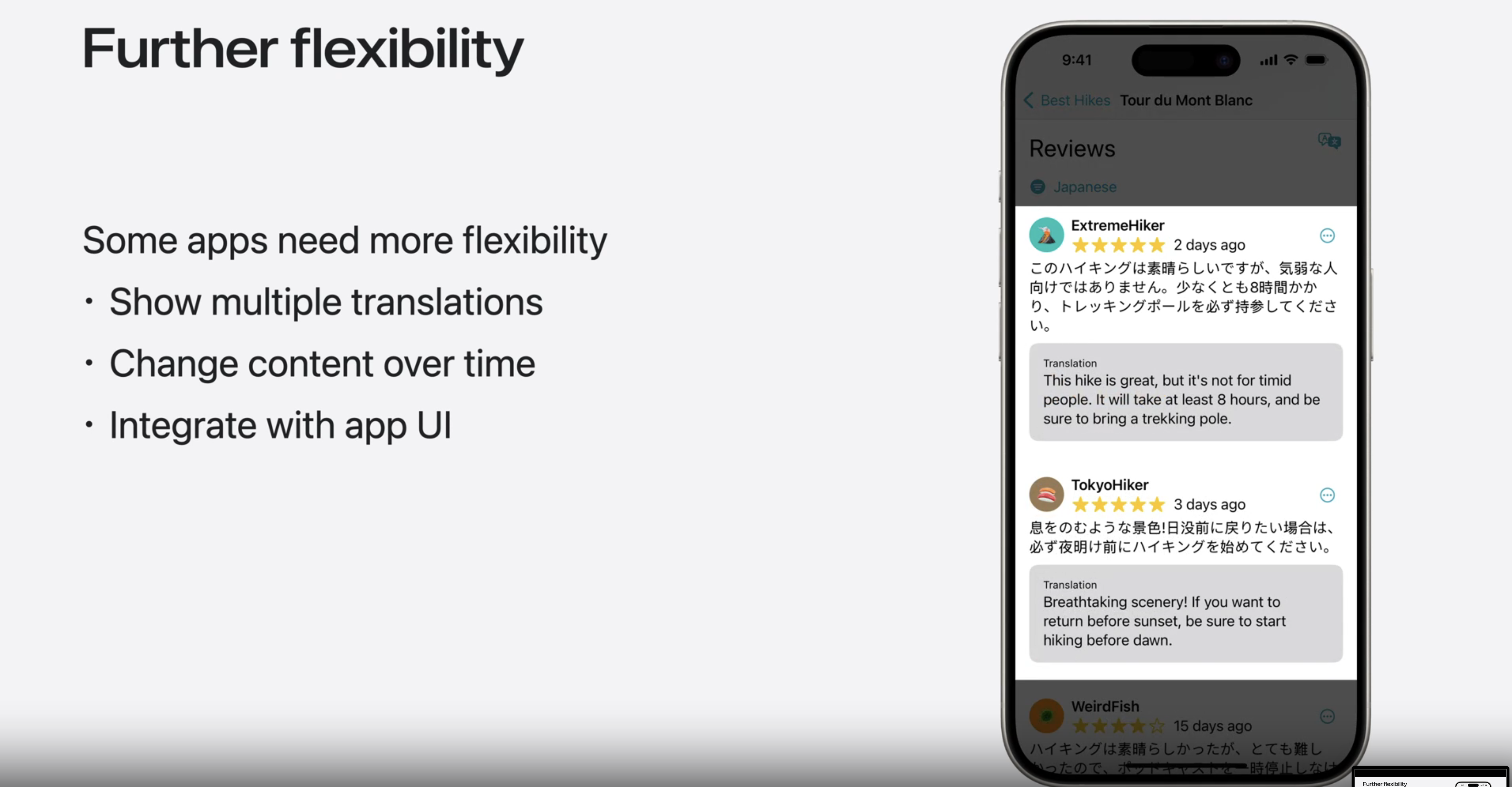 translationPresentation()을 사용하면 앱의 시스템 UI에 번역문을 쉽게 표시할 수 있습니다.