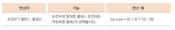 • 조건식의 결과가 true(참)인 경우와 false(거짓)인 경우에 따라 다른 결과가 수행됨