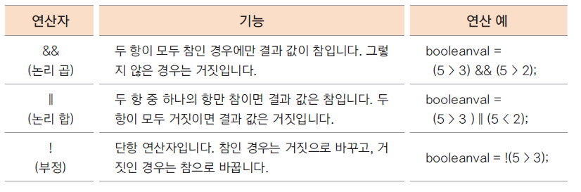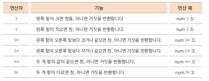 • 연산의 결과가 true(참), false(거짓)으로 반환 됨