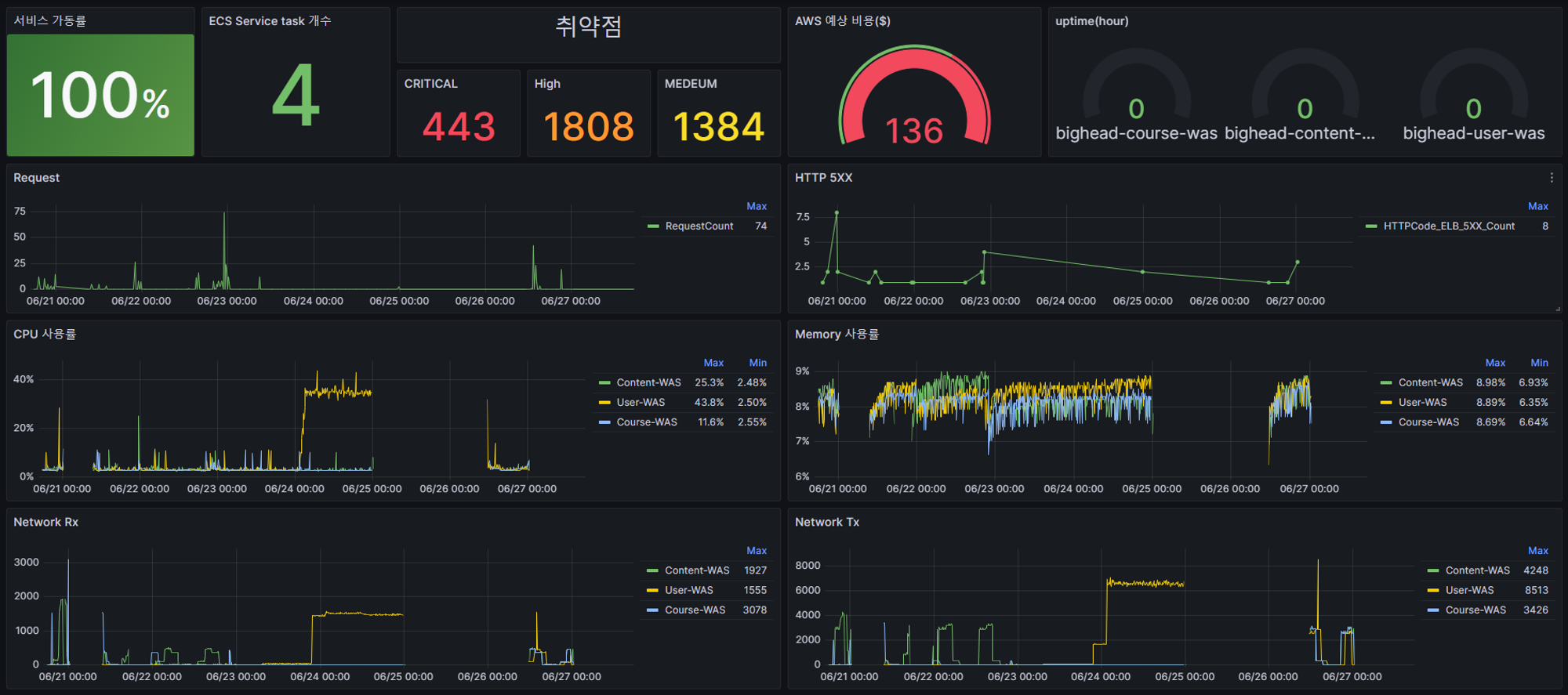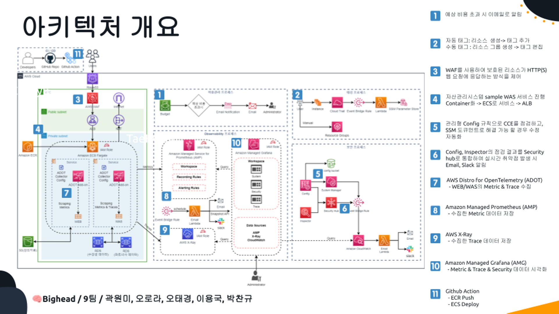 Cloud Trail, Resourcw Groups, Budget, AWS WAF, NAT, AWS Config, AWS Inspector, AWS Security Hub, AWS System Manager, EventBridge, Opentelemetry, AMP, AWS X-ray, Grafana사용한 서비스에 대한 설명은 추후에 자세하게 풀을 예정이다.
