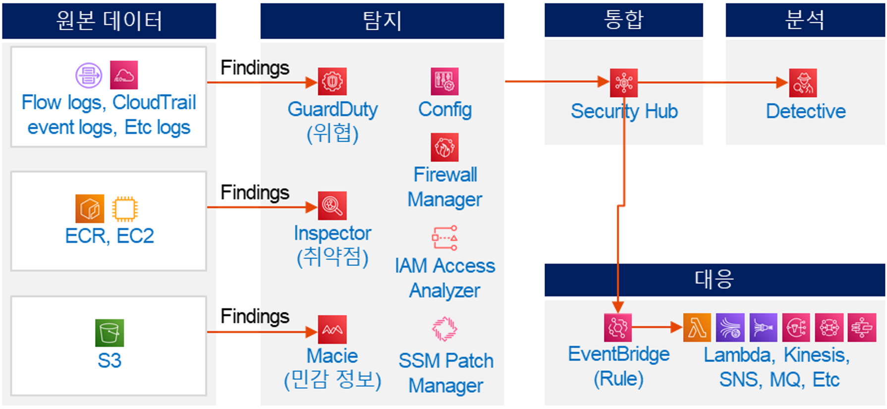 [1단계 : 원본 데이터]VPC, CloudTrail, S3 등을 사용 중이라면 별도 설정이 불필요하며, Inspector 경우는 IAM, VPC Endpoint, SSM Agent 설치 등 별도 조치가 필요합니다.