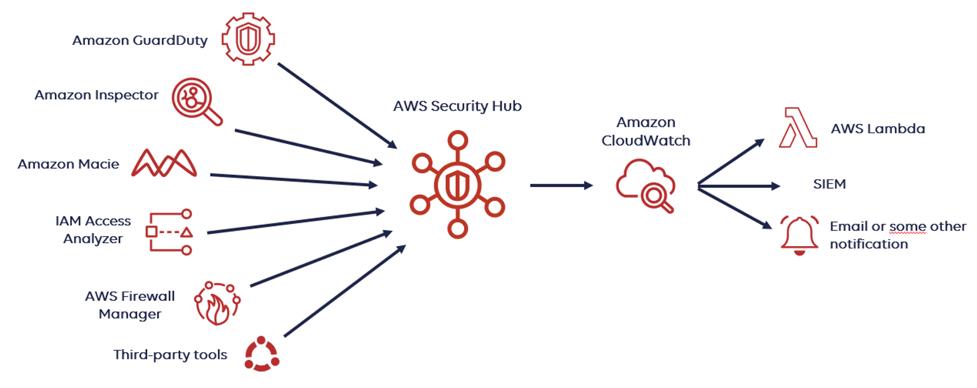 - AWS Security Hub – 이 AWS 서비스는 AWS 내의 보안 상태에 대한 포괄적인 보기를 제공함. Security Hub는 보안 제어를 사용하여 AWS 리소스를 평가하고 보안 업계 표준 및 모범 사례에 대한 규정 준수를 확인 (지원되는 서비스 및 제어 목록은 Security Hub 제어 참조를 참조)