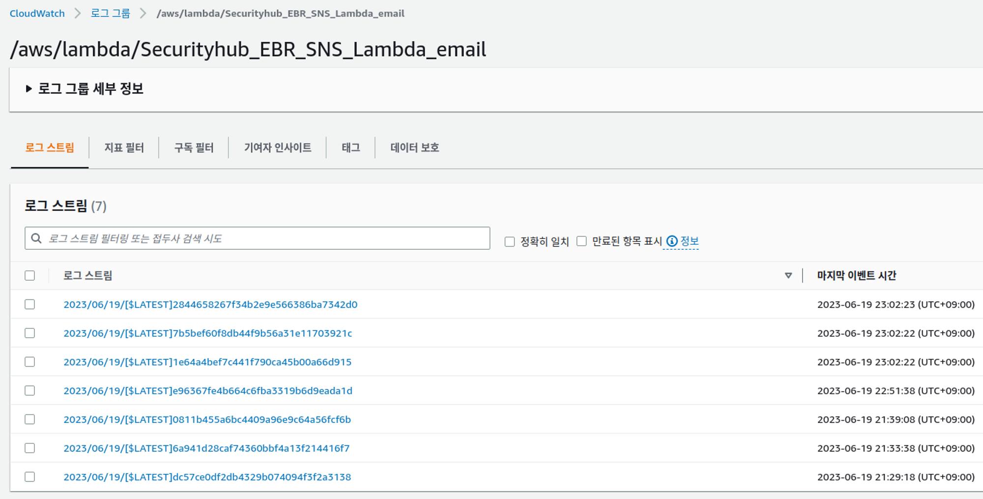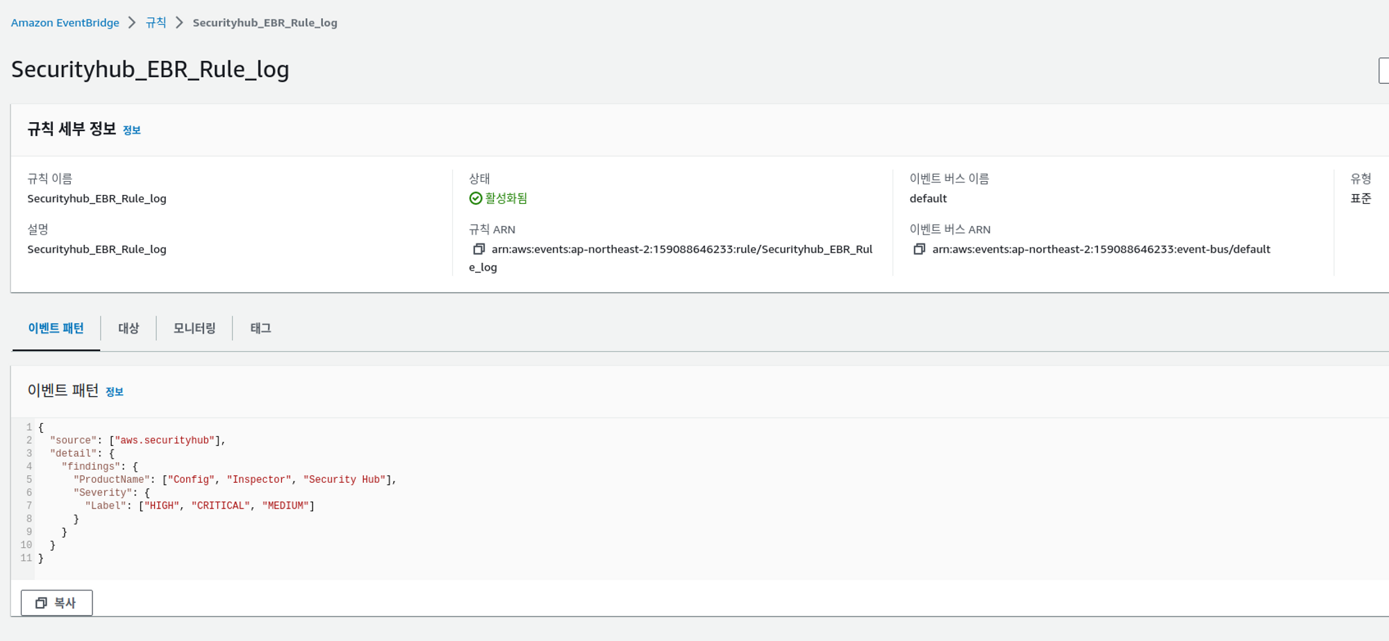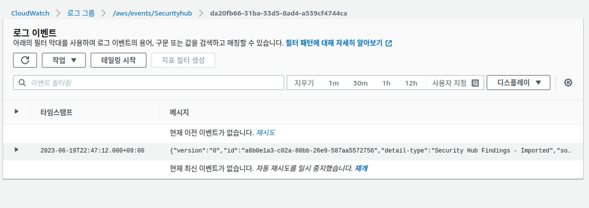 Security Hub의 로그가 Event Bridge Rule를 통해 CloudWatch로 갈 수 있도록 연결 하였다.