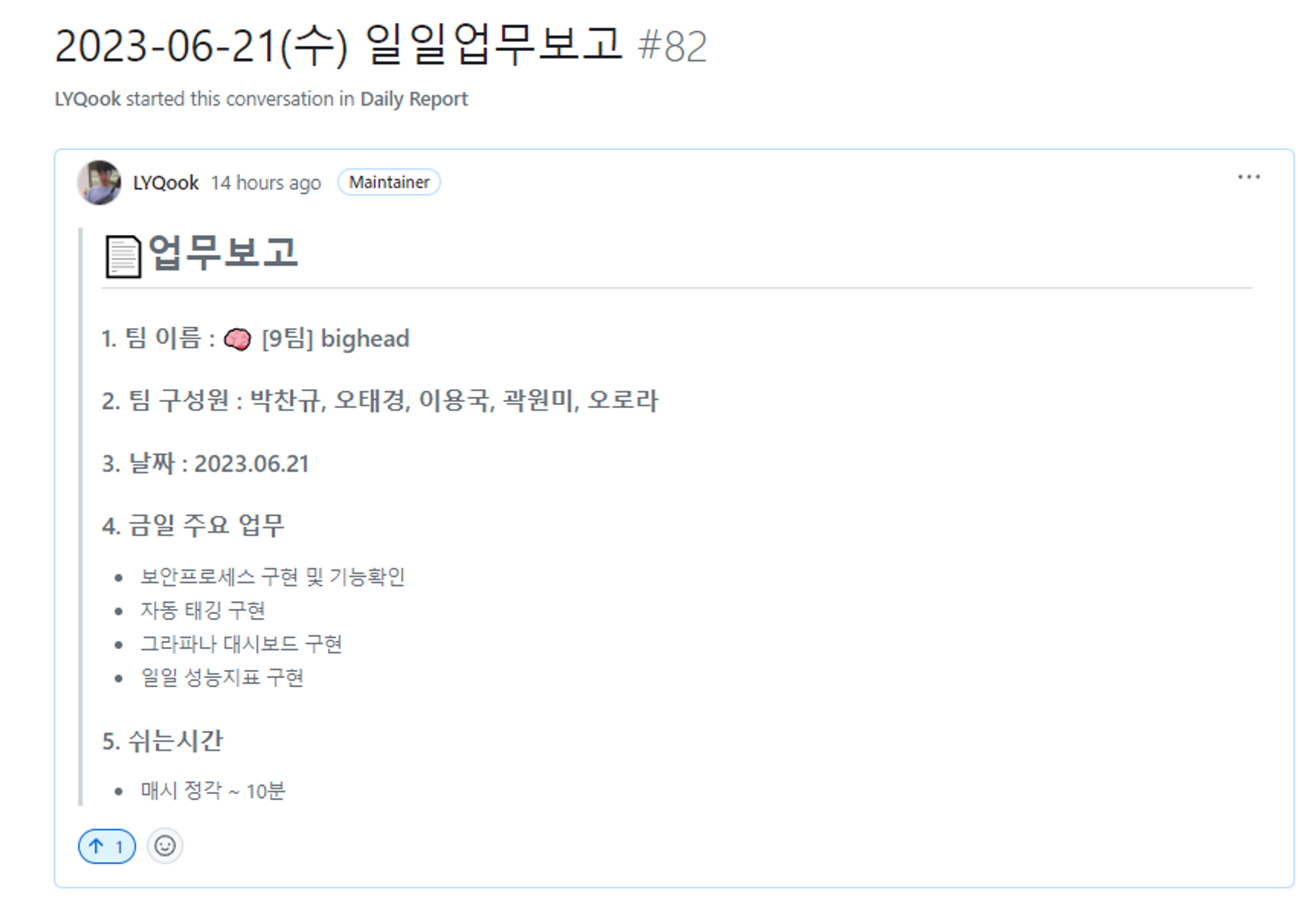 로그를 보면 가시화가 안되어 있어서 내일은 이 부분을 쿼리문을 수정하여 Slack에 가는 데이터와 비슷하게 출력해볼 예정이다.