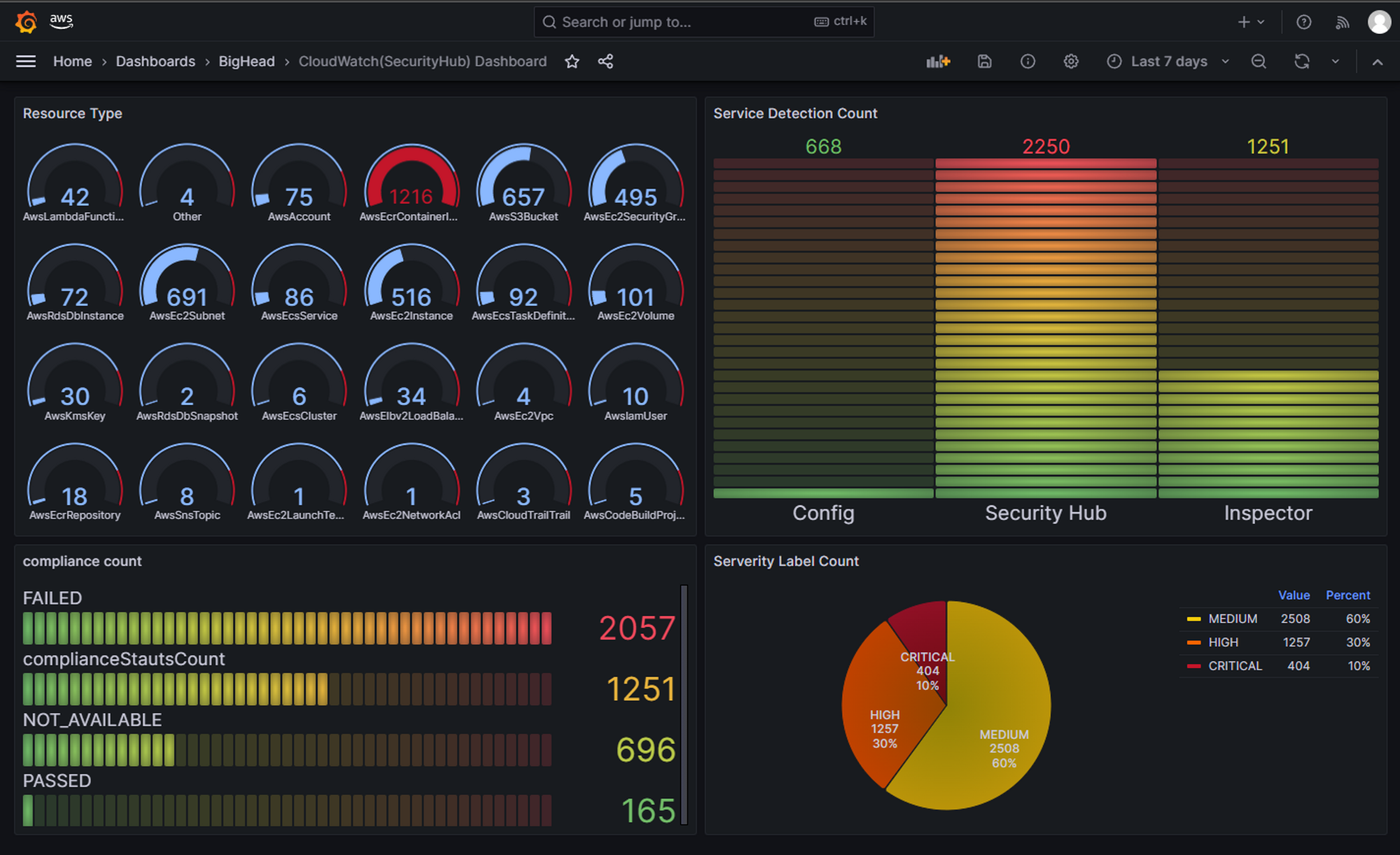 SecurityHub의 리소스, 취약점, 준수 현황, 라벨을 나누어 시각화 하였다.