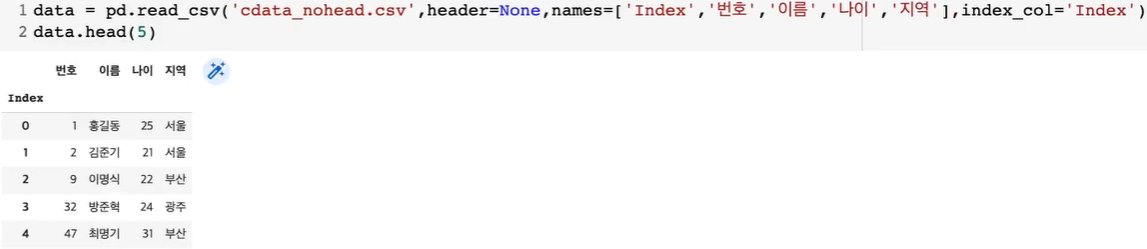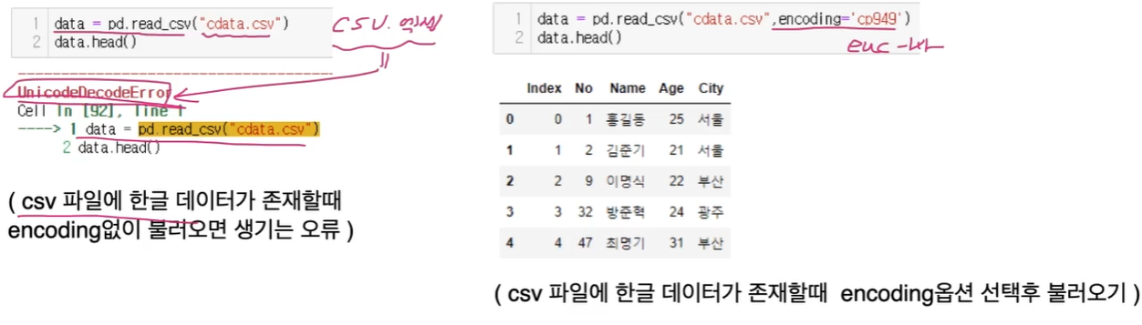 - encoding : 인코딩 타입 입력, 데이터가 한글이면 'CP949'