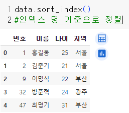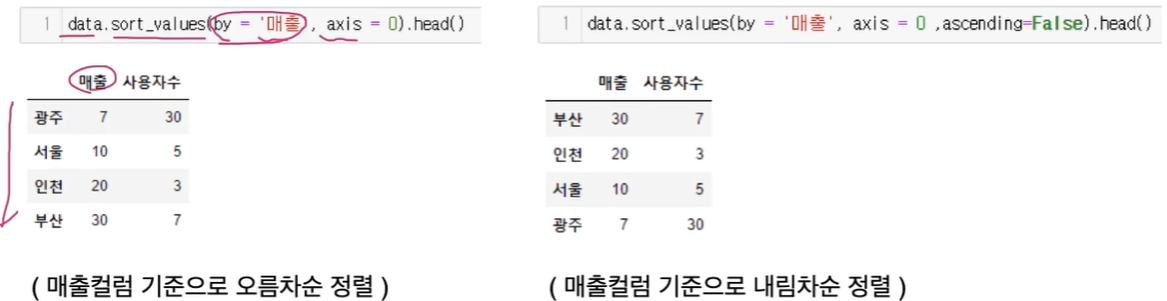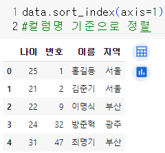 - axis : 0 - 행방향 정렬, 1= 열방향 정렬