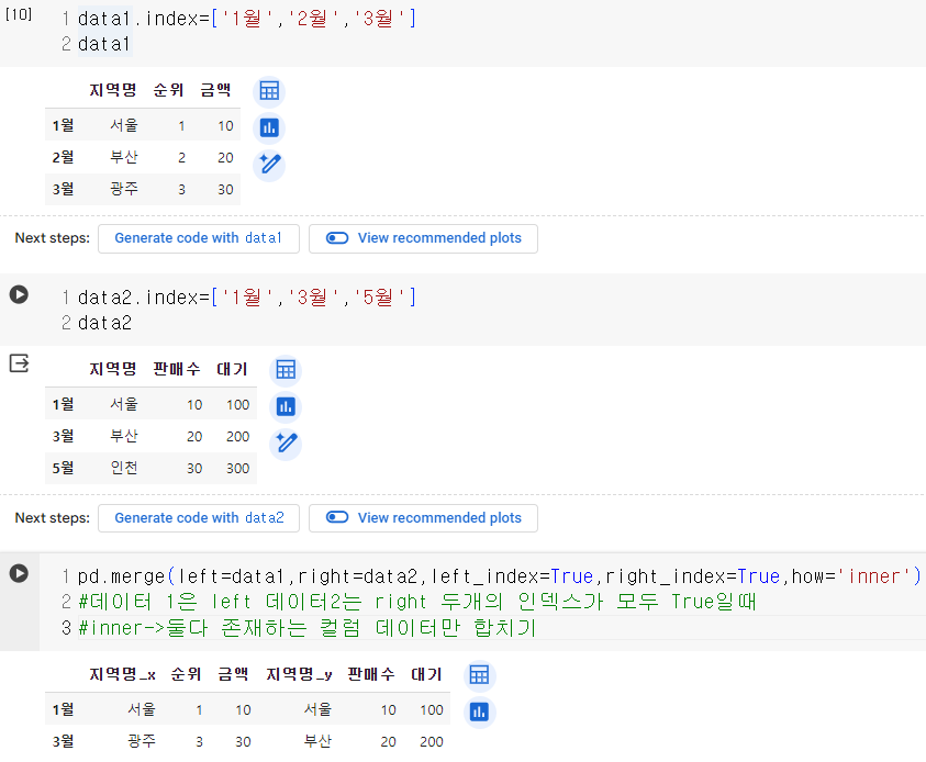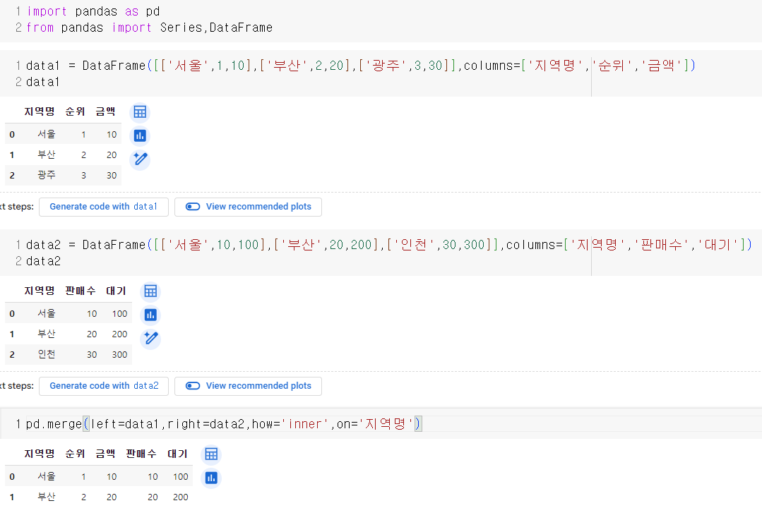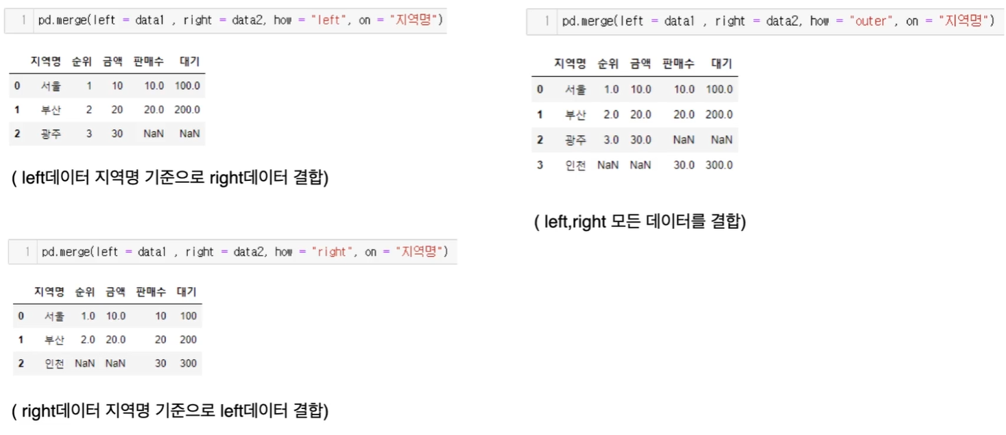 - inner : left,right에서 둘다 존재하는 컬럼 데이터만 합침