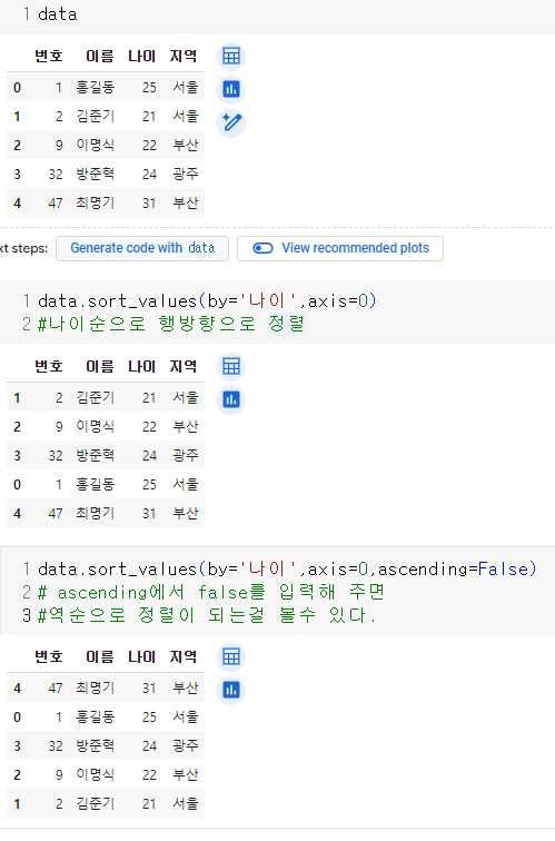 - ascending : True - 오름차순, False - 내림차순 정렬