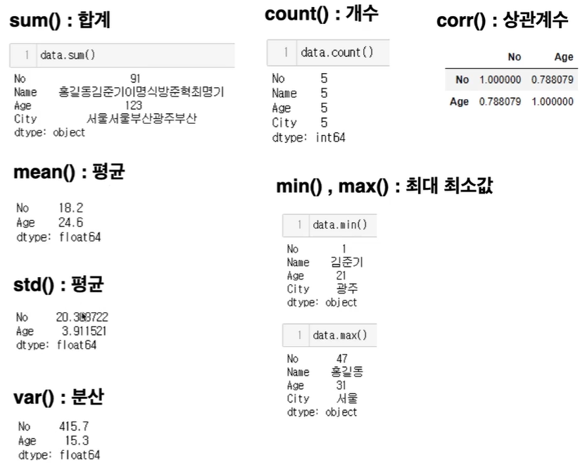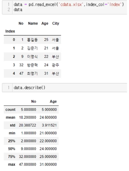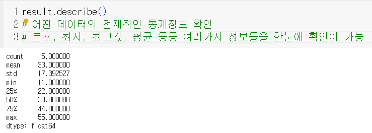 - describe() : 통계 요약(데이터 개수, 평균, 표준편차, 최소값, 4분위값, 최대값)