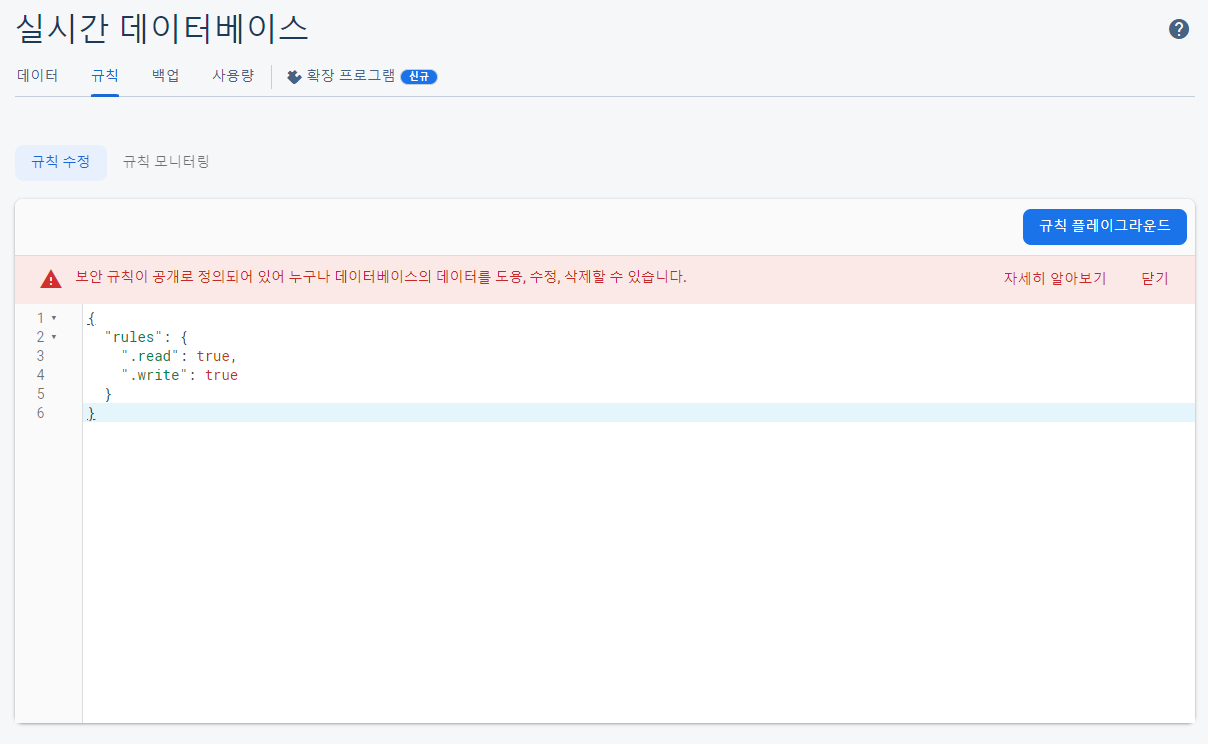 Realtime Database 규칙에 read, write를 모두 true로 변경하면 해결됨