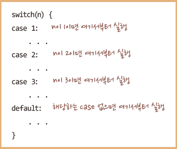 switch문은 괄호 안의 변수값에 따라 해당 case로 가서 실행문을 실행시킨다.