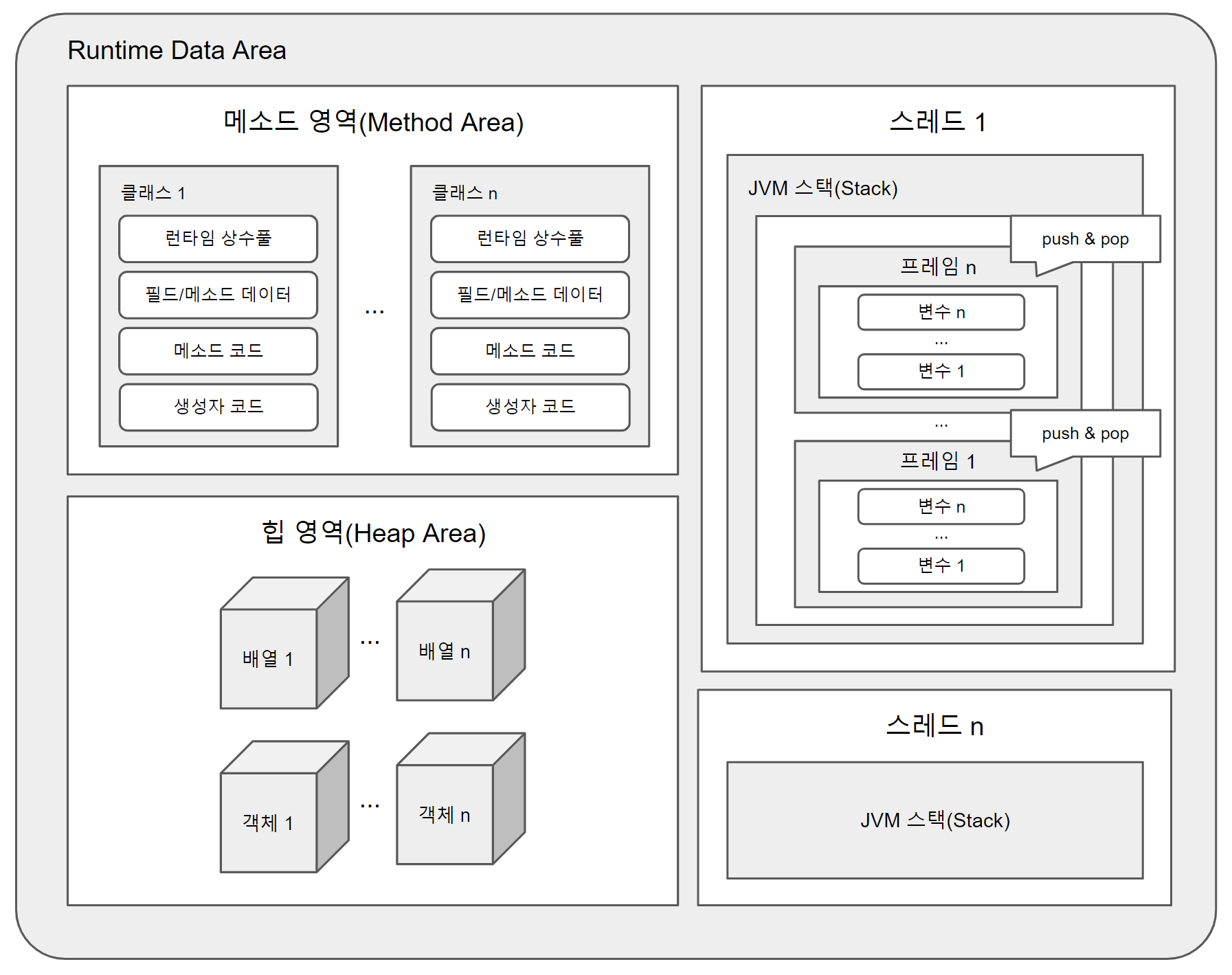 스택(Stack) 영역 : 메소드를 호출할 때마다 생성되는 프레임(Frame)이 저장되는 영역