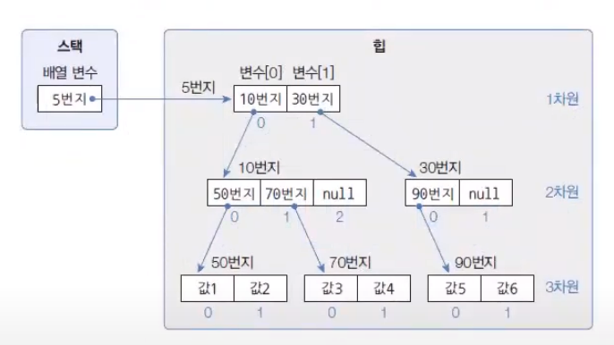 위 예제에서 arr1과 arr2에서 생성한 배열은 저장 항목은 같지만 서로 다른 배열 객체로 생성되므로 arr1과 arr2 변수에 대입되는 번지가 다르다. arr3은 arr2 변수의 번지가 대입되었기 때문에 같은 번지를 가진다.