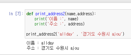 print_address2(name, address)와 같이 2개의 매개변수를 가지는 함수를 정의하여라. 이 함수를 호출할 때 print_address2("allday","경기도 수원시 ajou")라고 호출하면 아래와 같이 나오도록 함수를 작성하시오.