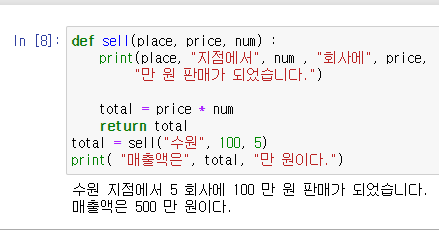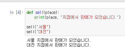 def sell(place): # 가인수 개념 print( place , "지점의 판매가 되었습니다.") sell("서울") # 실인수 개념 sell("대전") # 실인수 개념