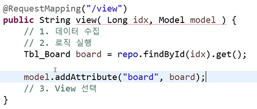 - 일회용 데이터니까 model로 집어넣고 model을 board라는 이름으로 넣어준다.