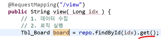 - 2.이걸 사용하기 위해서는 get으로 꺼내서 줘야 쓸 수 있게된다.(한개만 가져올때는)