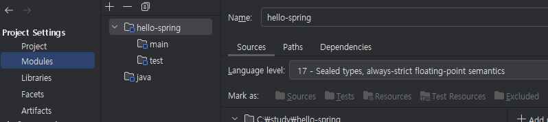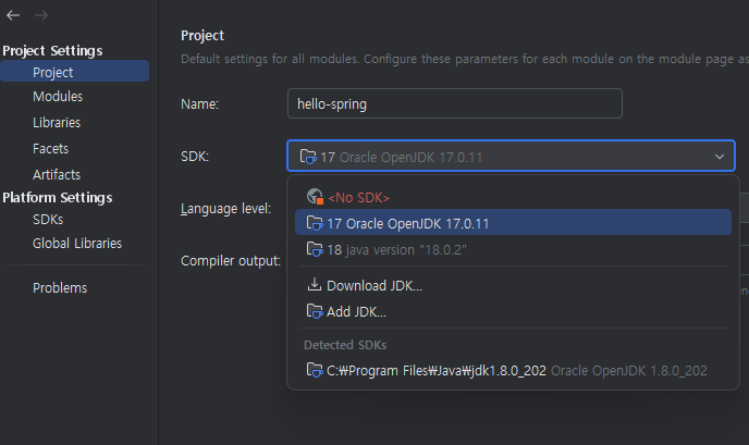 3번째로 IDE의 JDK 세팅에 버전이 17로 작성해야 하는데