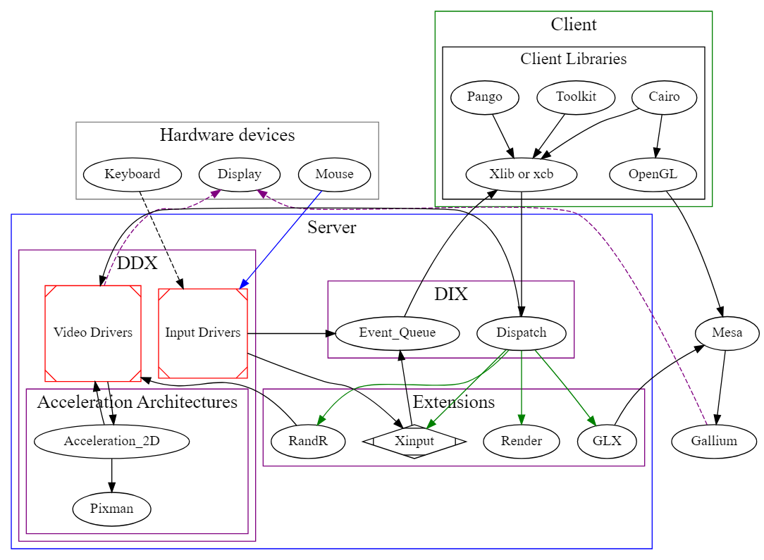 DIX는 X 서버의 핵심으로 Event Queue를 통해 입력 이벤트를 X의 클라이언트에게 전달합니다. 사용자와의 상호작용을 마친 X 클라이언트는 그 결과를 다시 서버로 전달합니다. 서버는 그 결과물을 Mesa를 통해 그래픽 드라이버로 내보냅니다.