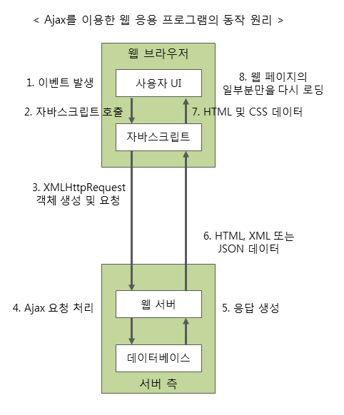 AJAX는 HTML 페이지 전체가 아닌 일부분만 갱신할 수 있도록 XMLHttpRequest객체를 통해 서버에 request한다. 이 경우, XML이나 JSON형태로 필요한 데이터만 받아 갱신하기 때문에 그만큼의 자원과 시간을 아낄 수 있다.