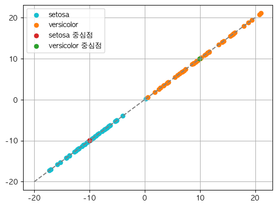 #클래스별 평균벡터와 데이터의 직선으로의 투영값