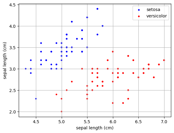 여기서 특성 'sepal length (cm)', 'sepal width (cm) 두가지만 사용해서 시각화를 해보겠습니다.