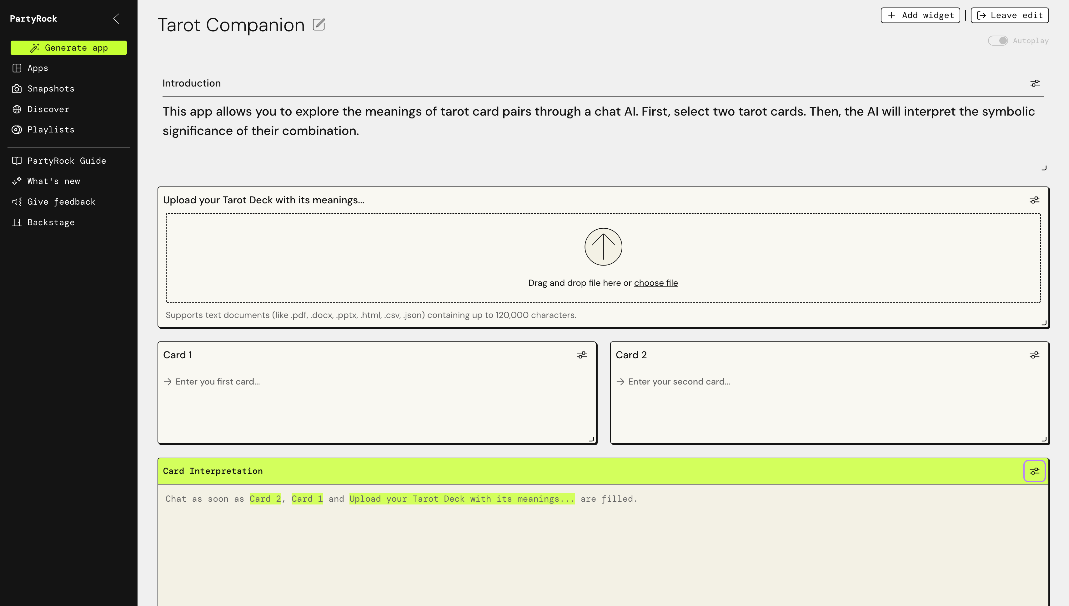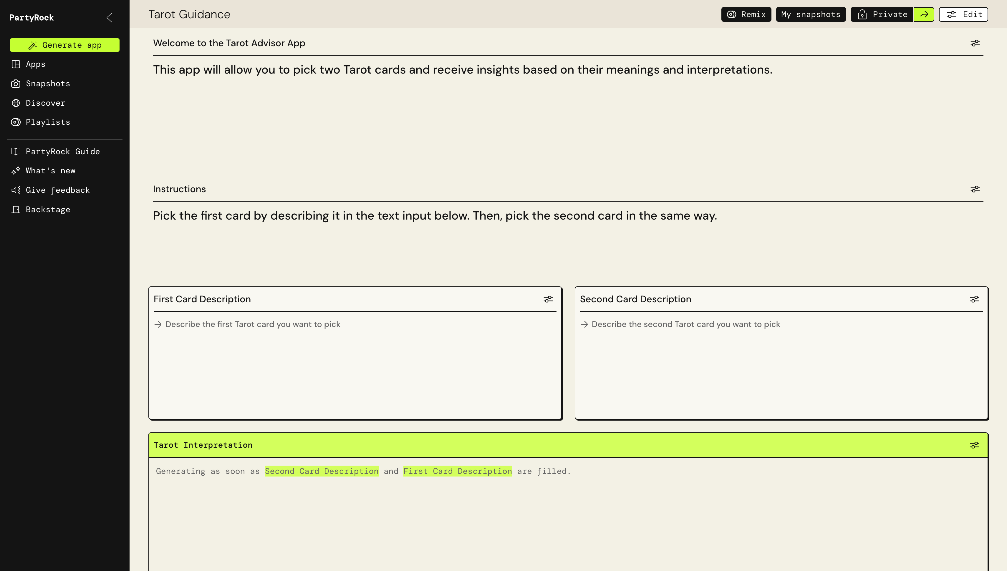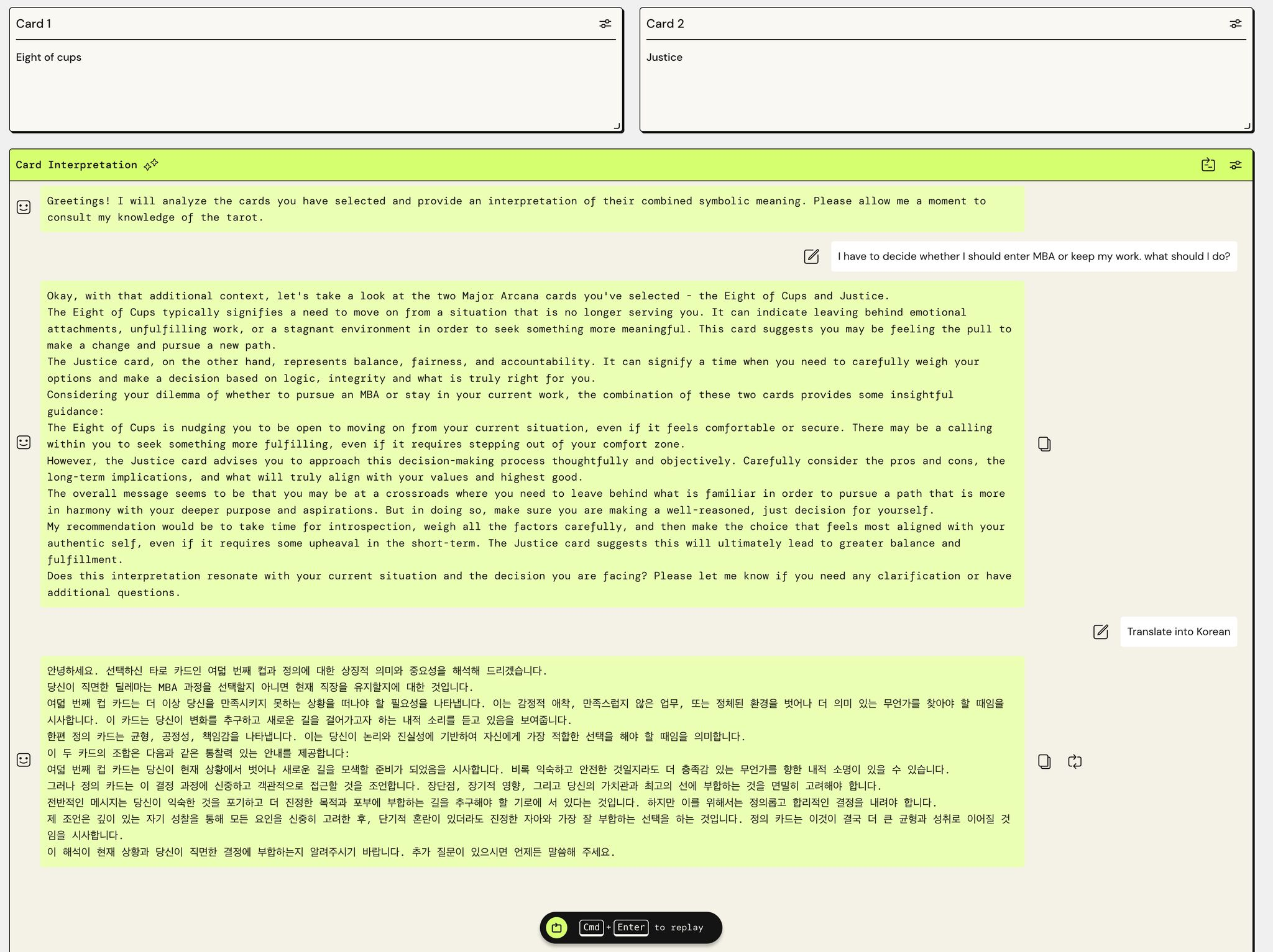 "An app that make an advise based on a pair of tarot cards that user has picked" 라고 입력해 주면