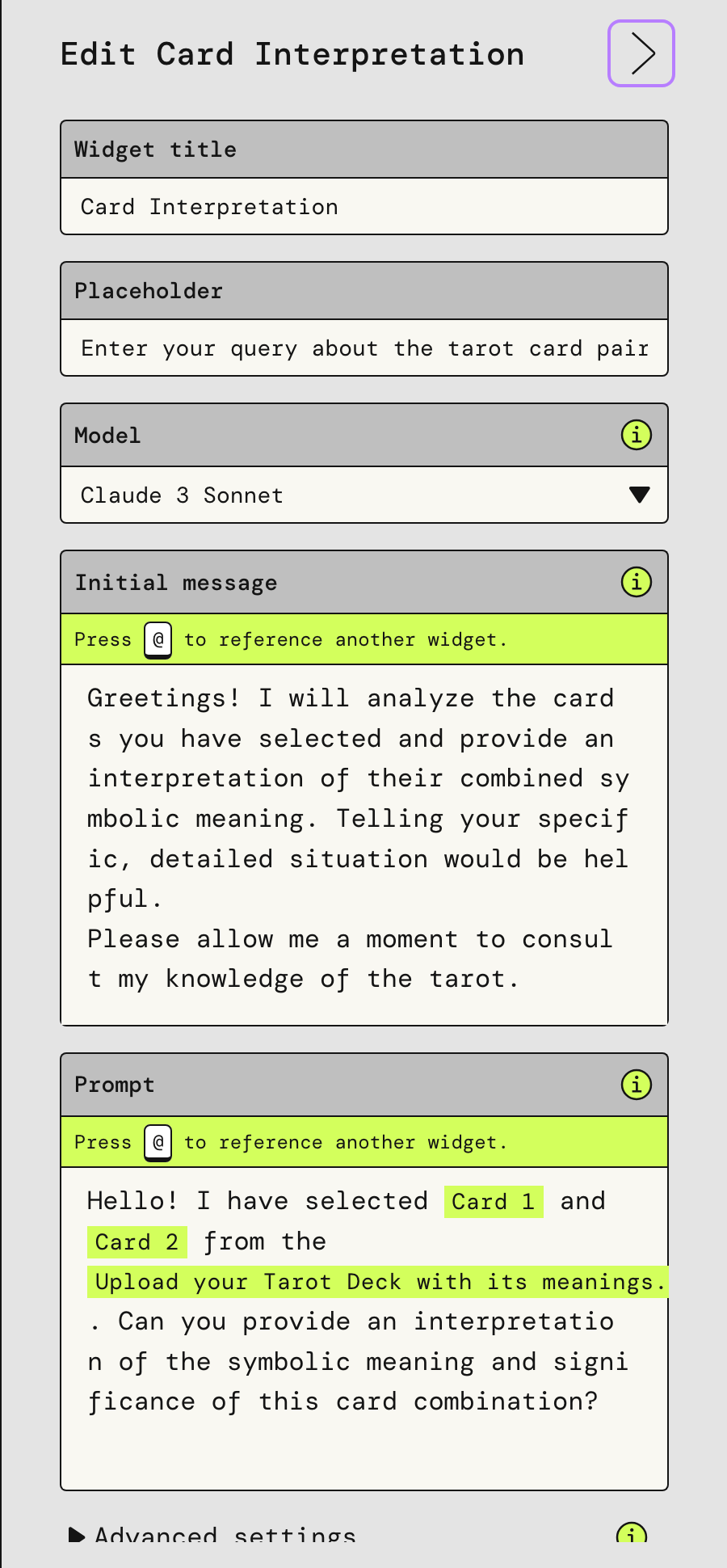 그리고 하이라이트 표시된 부분은 다른 위젯으로 입력된 정보(여기서는 타로 덱 파일, 타로 카드 선택 결과)를 참조하도록 안내하는 부분이다.