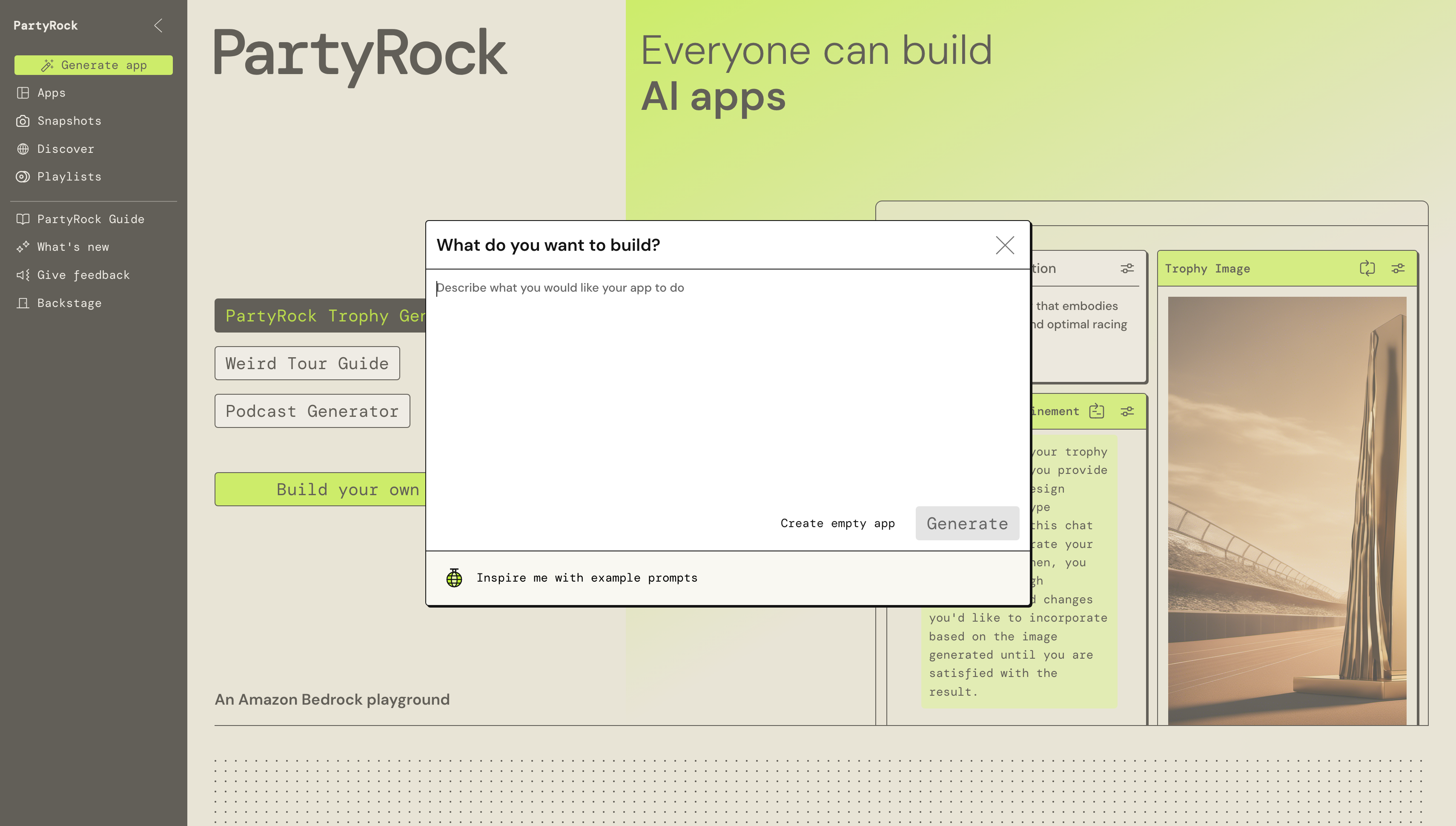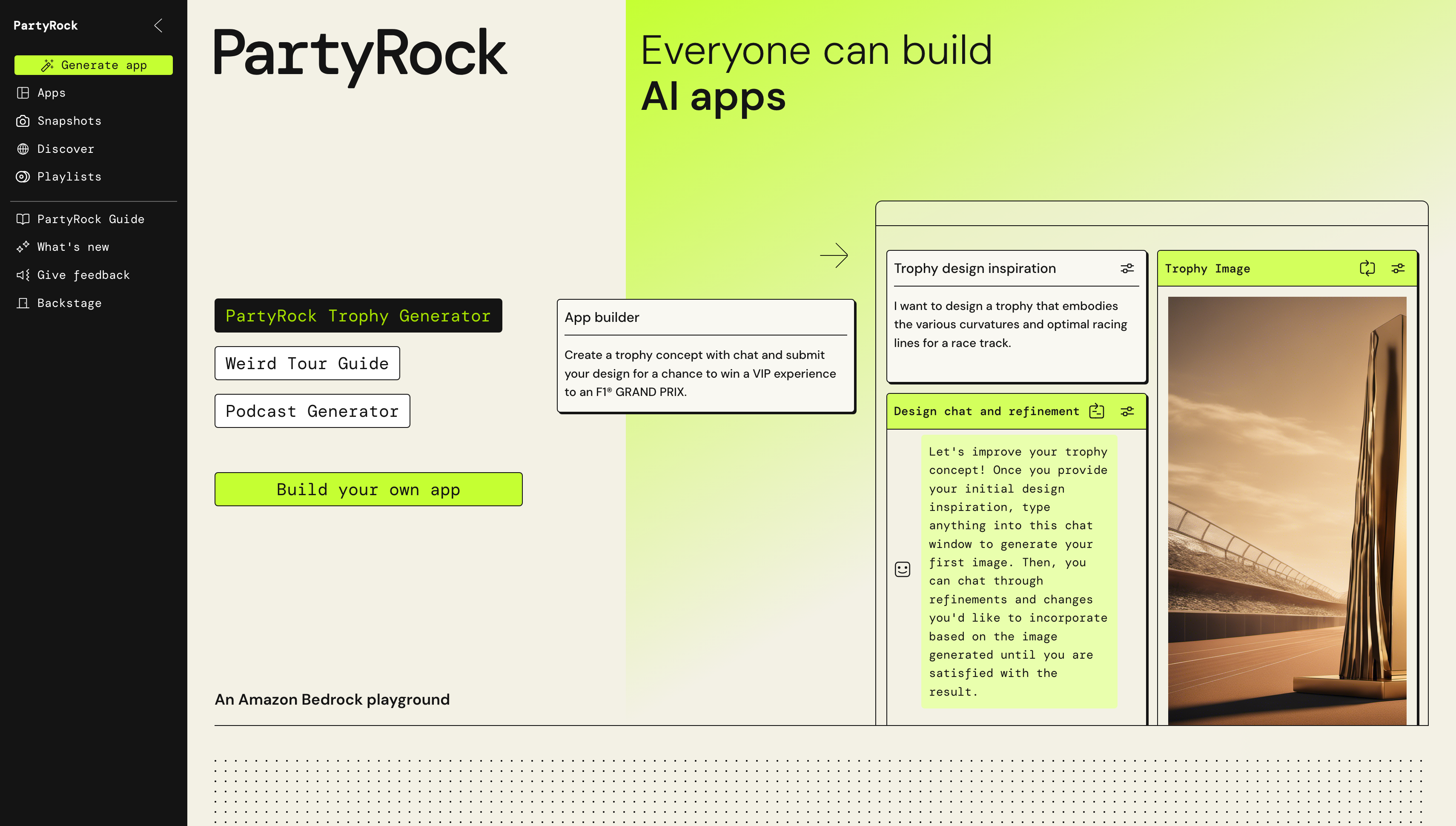 Amazon Partyrock을 활용하면 코드 없이, Bedrock 기반의 AI 앱을 쉽게 구축할 수 있다.