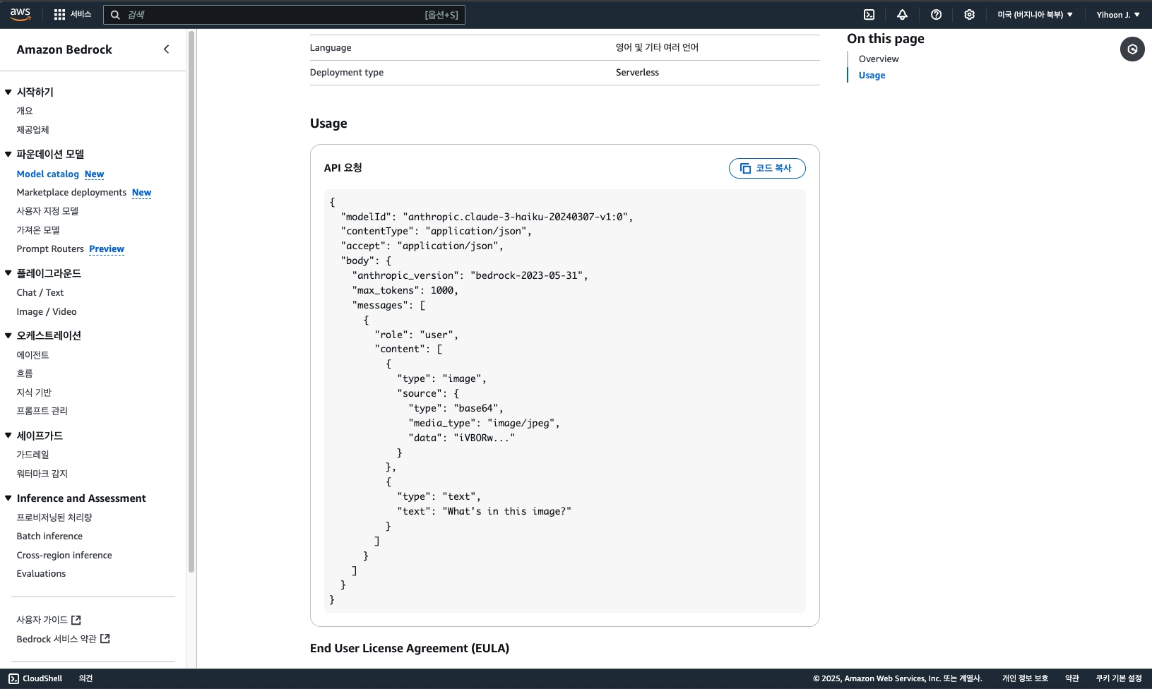 모델을 통해서 다양한 질의를 던지는 것은 0편에서 이미 구경했으므로 여기서는 생략하겠다. 실제 서비스 구축 시 Bedrock은 API로 연결되는데, 요청 시 필요한 json 구분은 카탈로그에서 확인할 수 있다. 이 구문을 이용하여 이제 서비스를 제작해 보자.