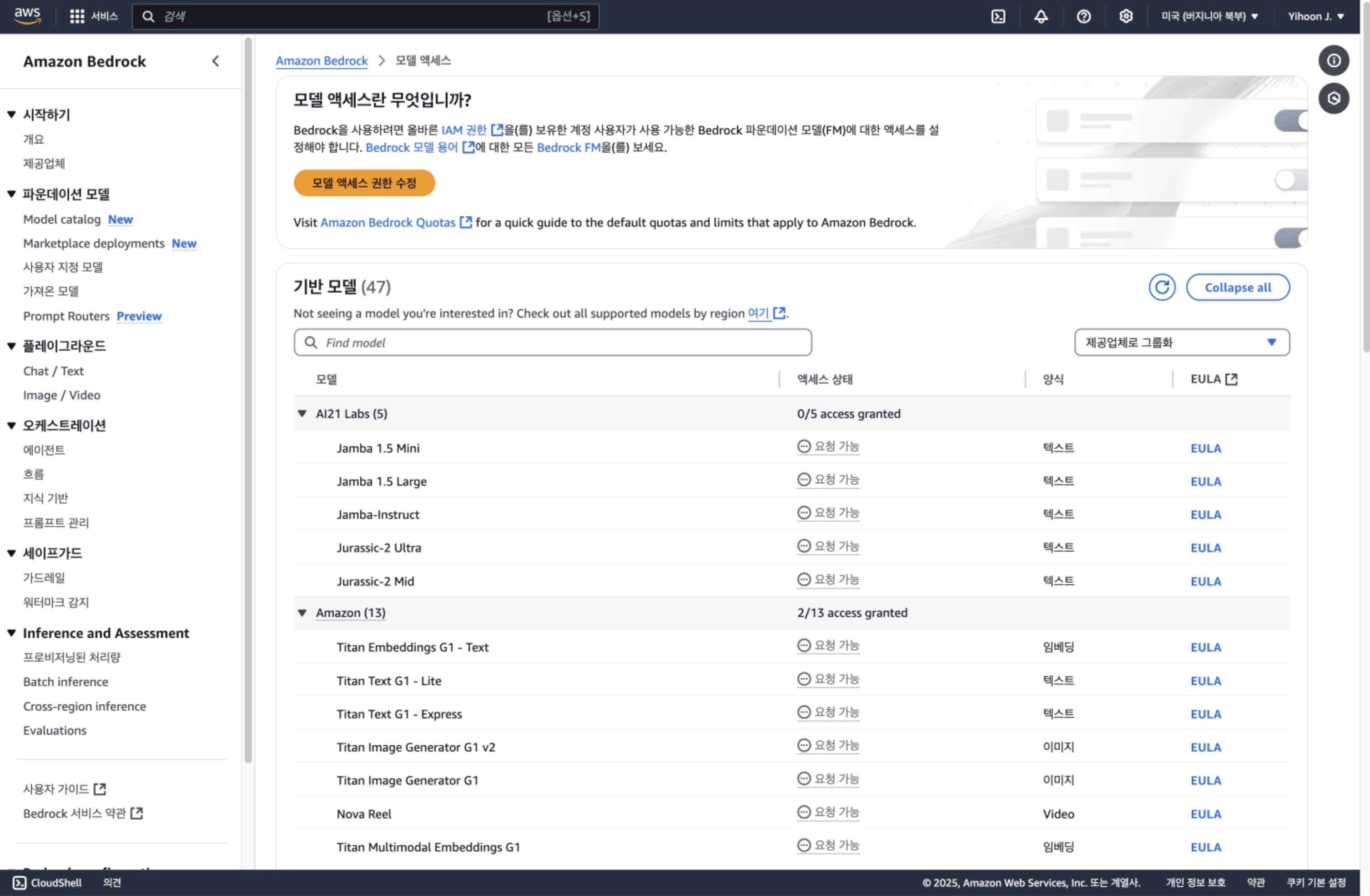 현재 Bedrock은 리전마다 제공되는 모델에 조금씩 차이가 있는데, 가장 다양한 모델을 제공하는 곳은 us-east-1 리전이다. 물론 다른 리전에서 제공되는 모델도 계속해서 늘어나고 있다.