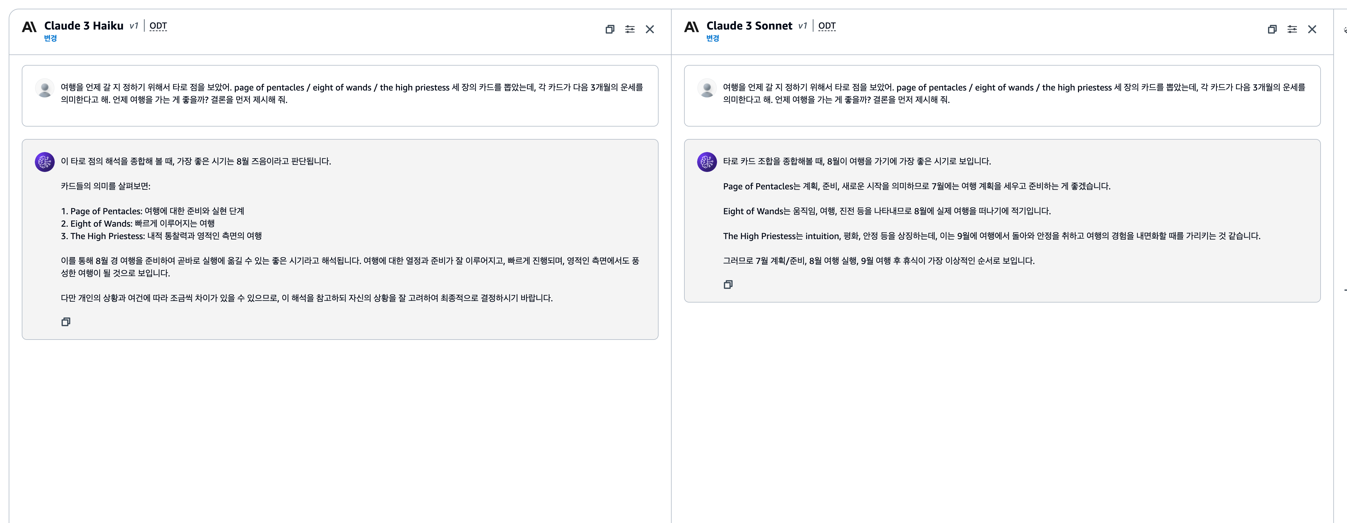 Bedrock의 Playground에서는 액세스를 보유한 모델들을 갖고 자유롭게 대화를 나누고 또 여러 가지 모델에게 동일한 프롬프트를 제공해 결과물을 비교할 수도 있다. 여기서 여러 가지 카드 해석 질문을 던지고 그 답변을 보며 베이스 모델을 Claude 3 Sonnet으로 정했다.