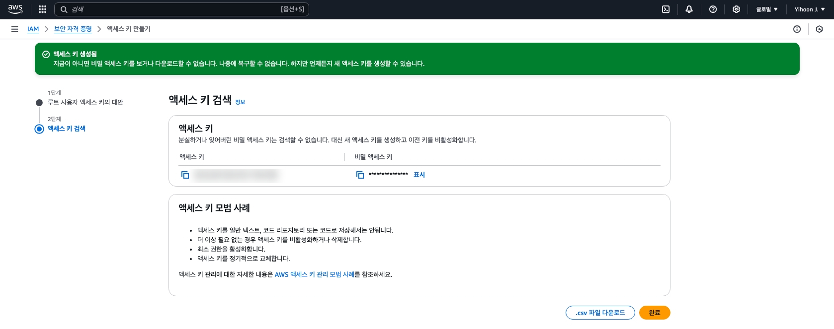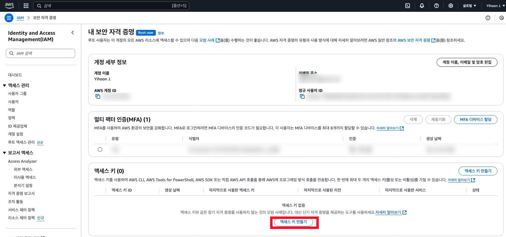 원래는 루트 사용자 명의로 액세스 키를 만들면 안 된다.