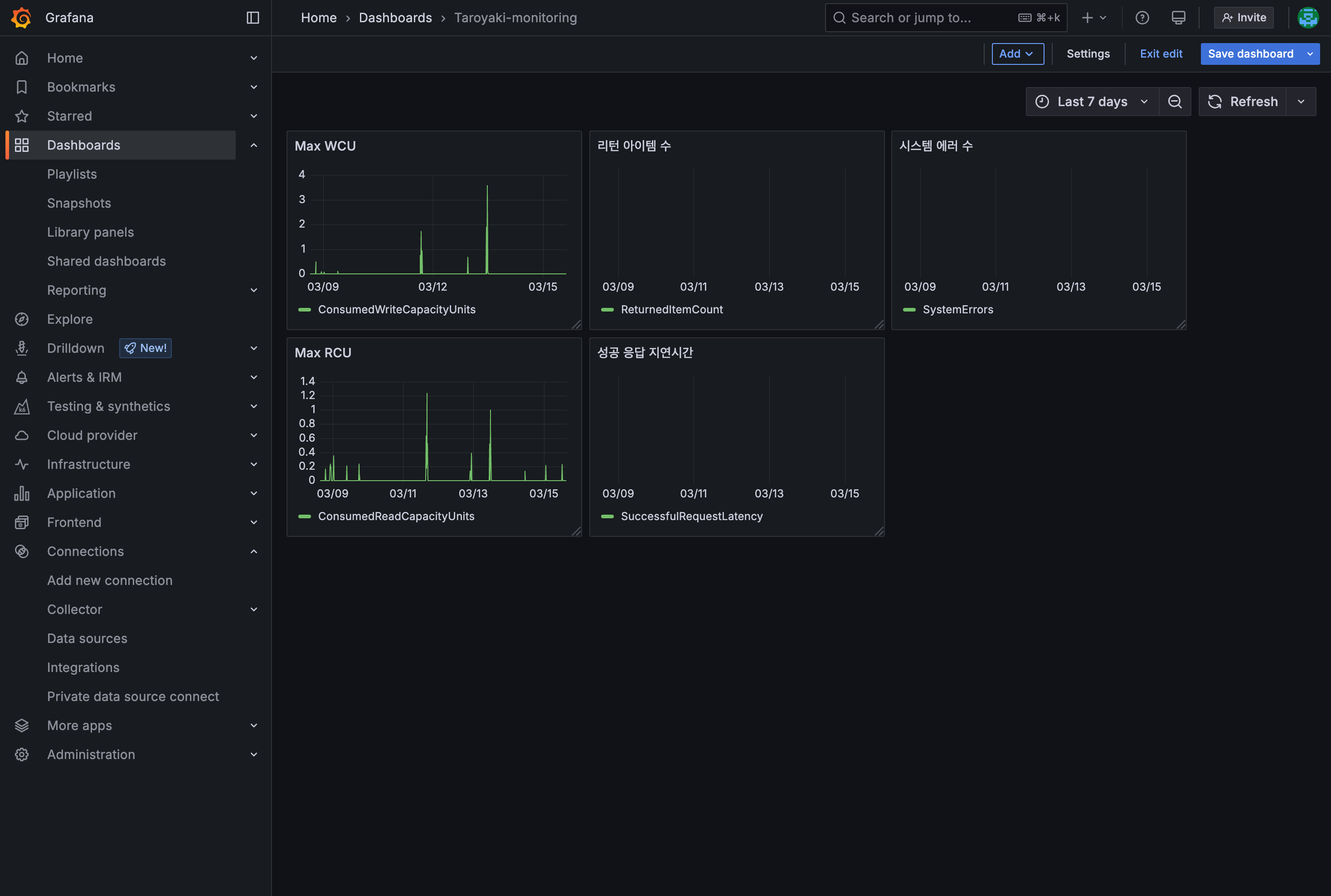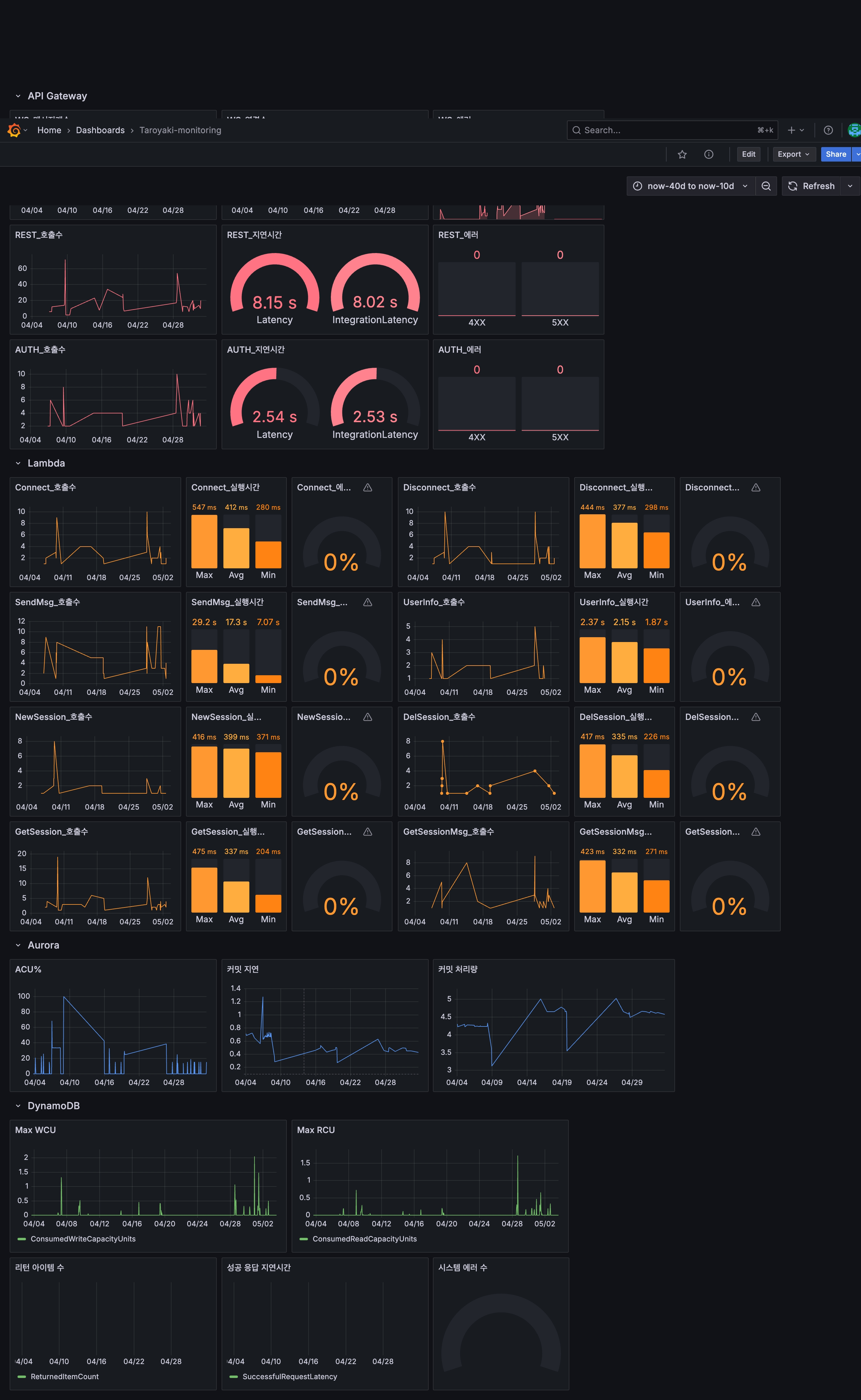 베타테스트 당시 해당 대시보드를 적극적으로 확인하였다. 에러율과 지연 속도를 확인하고 그로서 추가적인 최적화가 어디가 필요한지 참고하는 데에 큰 도움이 되었다.