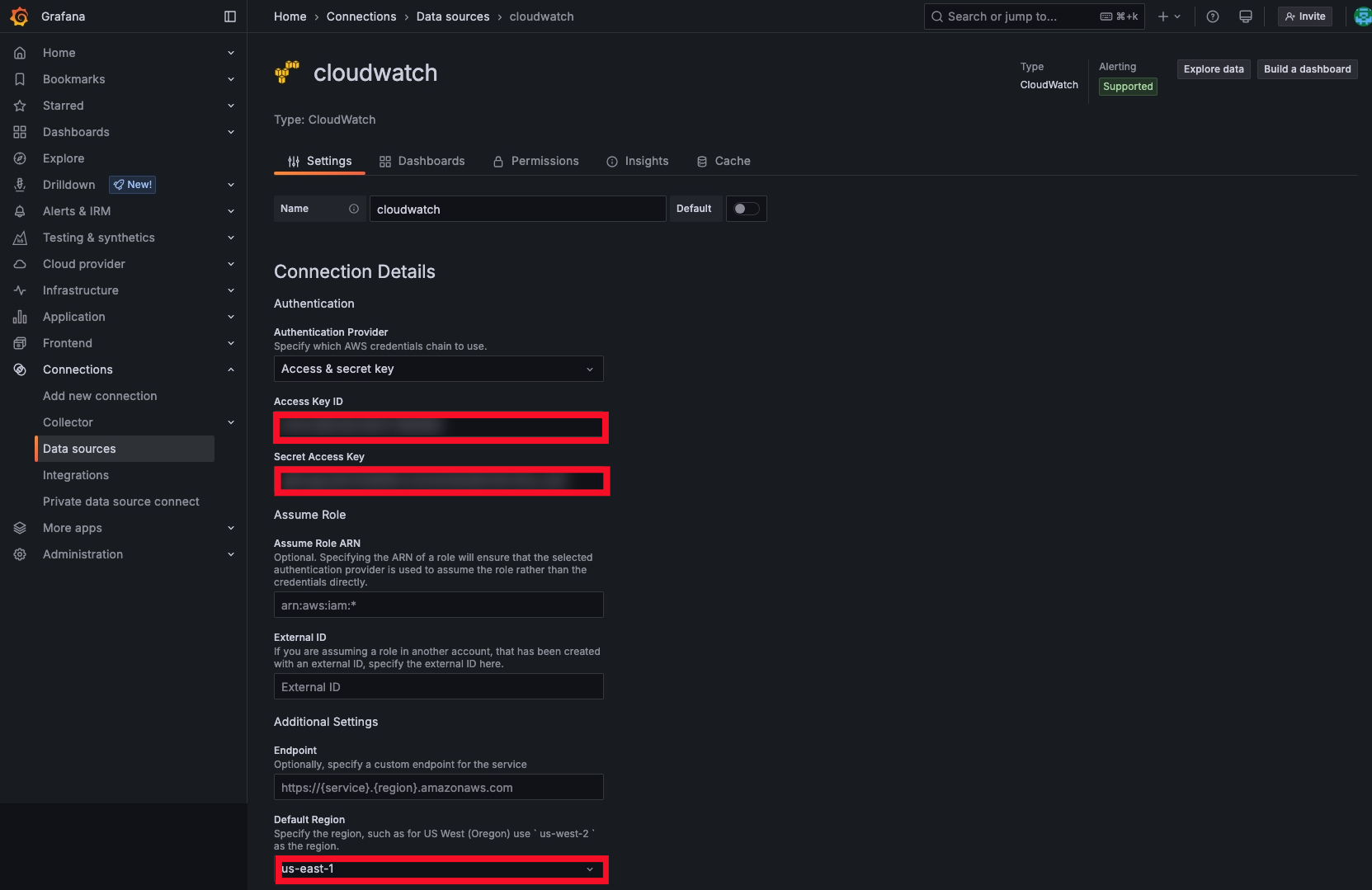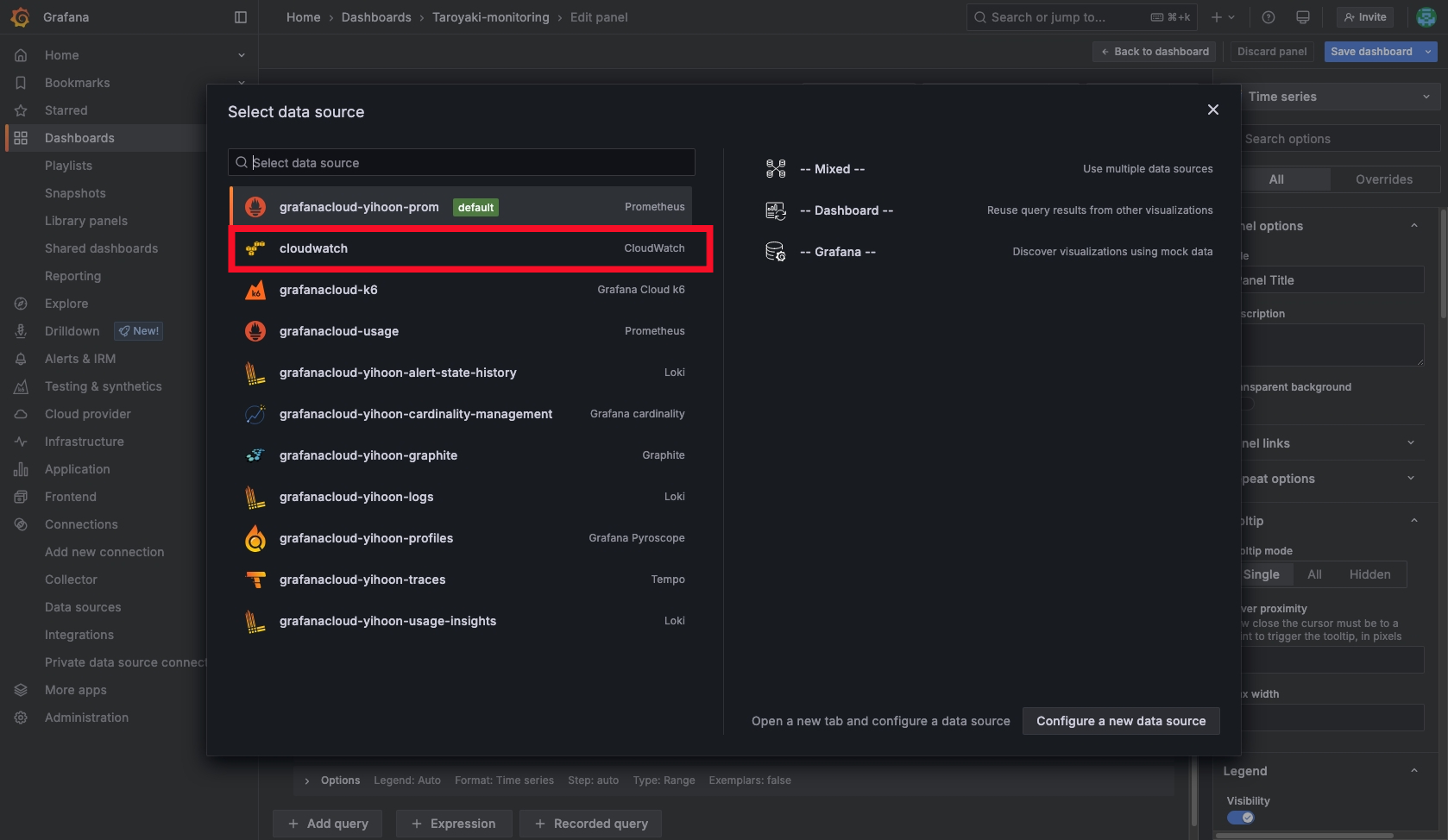 대시보드에서 데이터 소스를 추가해야 한다. 일단 데이터 소스로 cloudwatch를 추가하자.