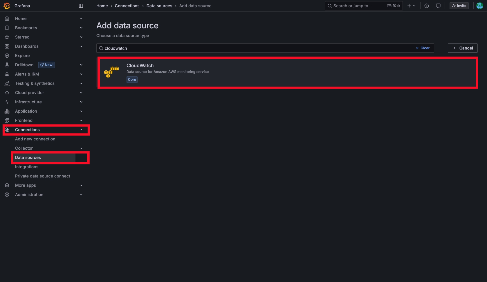 이어지는 화면에서 데이터 소스로 cloudatch를 선택한다.