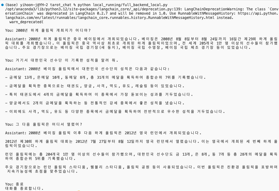 코드를 실행하면 다음과 같이 이전 맥락을 기억하여 대화가 반복적으로 이루어짐을 볼 수 있다.