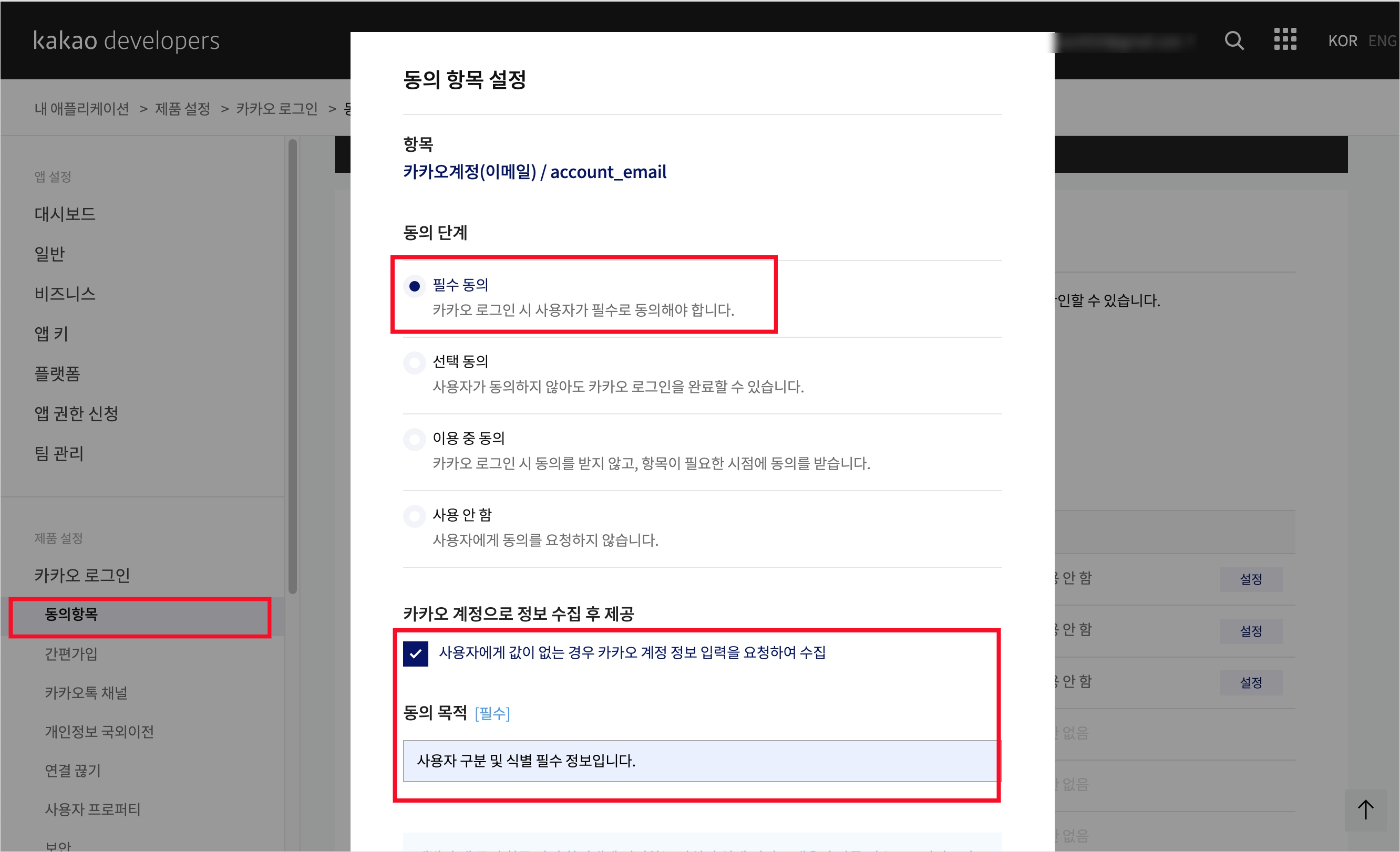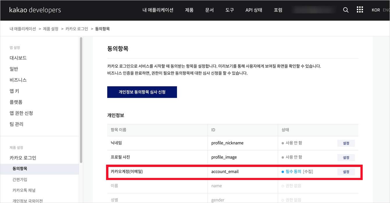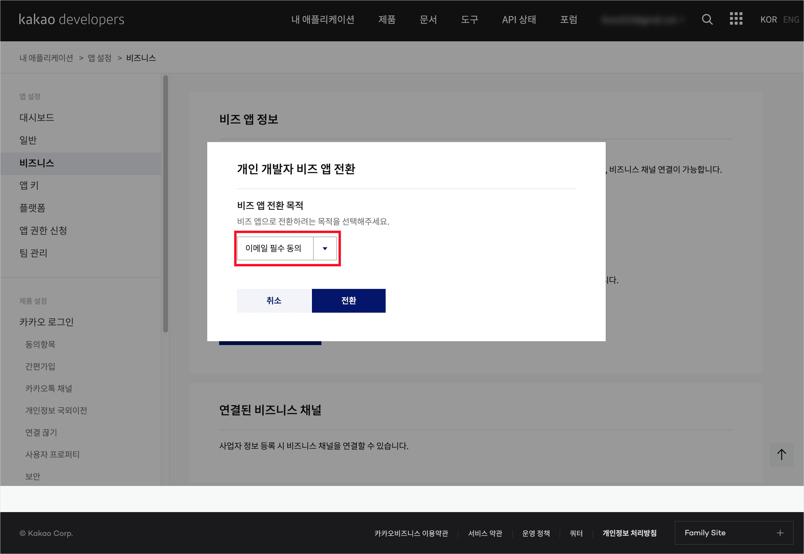 개인 > 비즈 앱 전환 > 이메일 필수 동의 선택하여 전환하였다.