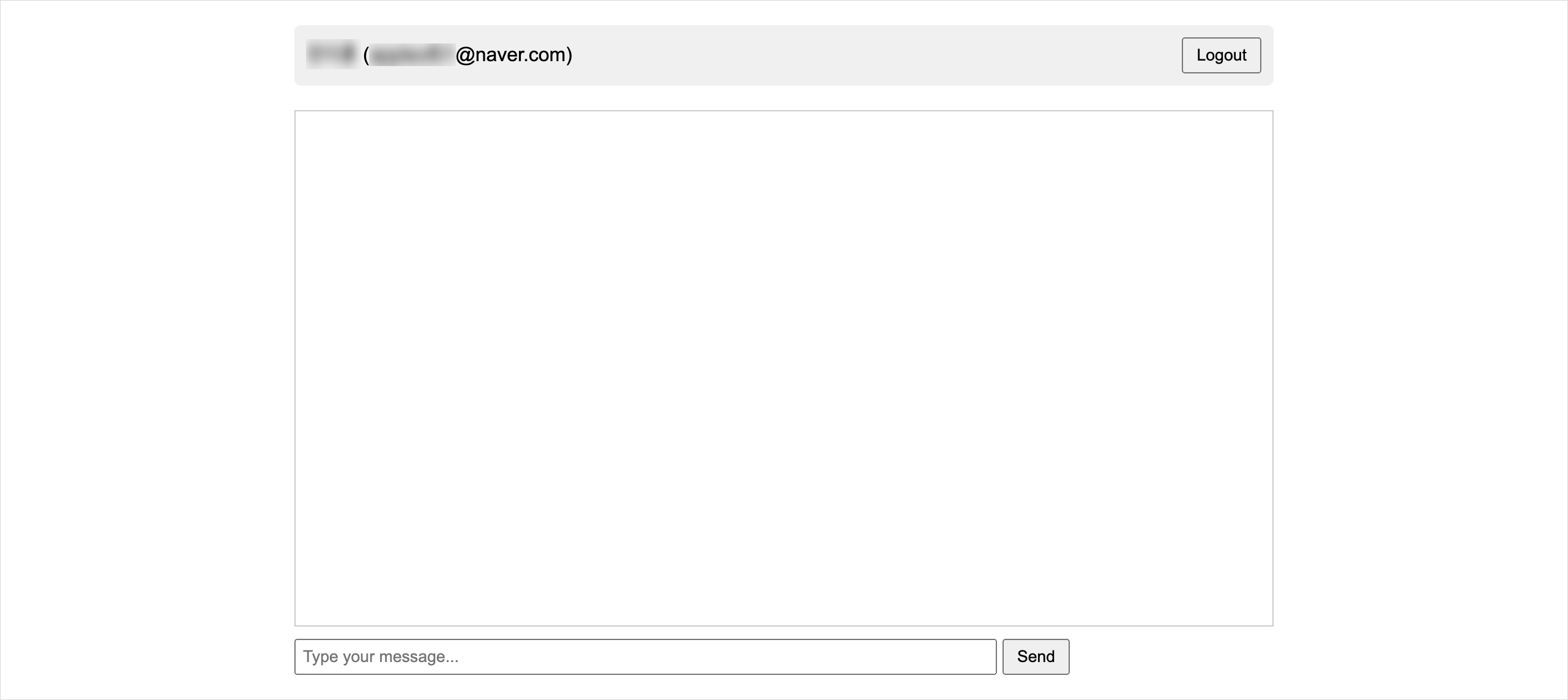 프론트 코드 양이 방대한 관계로 클라이언트 코드들의 중간 버전은 별도로 다루지 않겠다. 카카오 도메인을 통해 로그인하고 나면 아래와 같이 원시적인 형태의 챗봇 화면이 표시된다. 위쪽 회색 박스에 사용자 정보가, 그리고 가운데 흰 박스에 대화가 표시되는 형식.