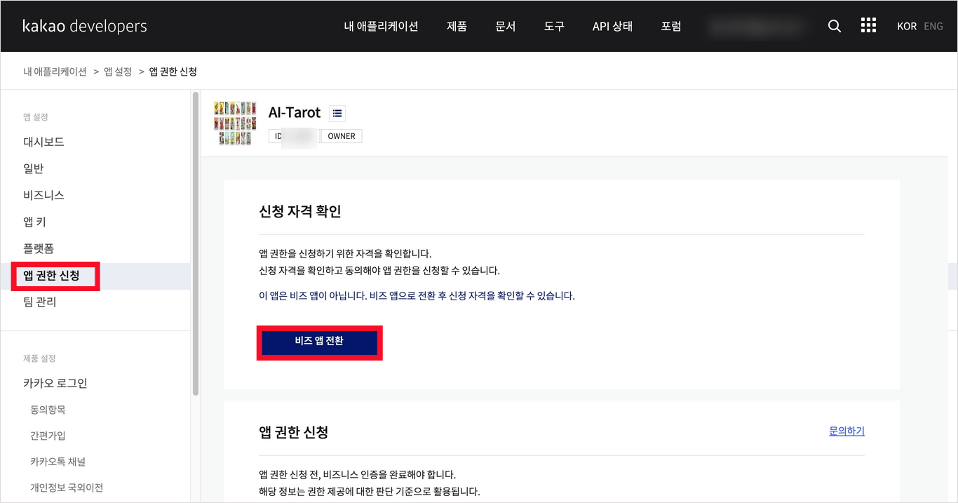 다음으로 이메일 동의를 받기 위해 앱 권한 신청 > 비즈 앱 전환을 한다.