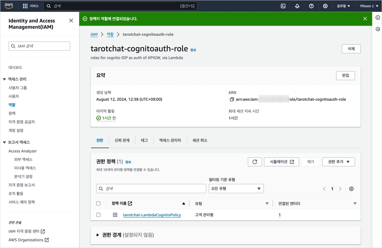 해당 정책을 사용하는 사용하는 tarotchat-cognitoauth role을 생성하였다.