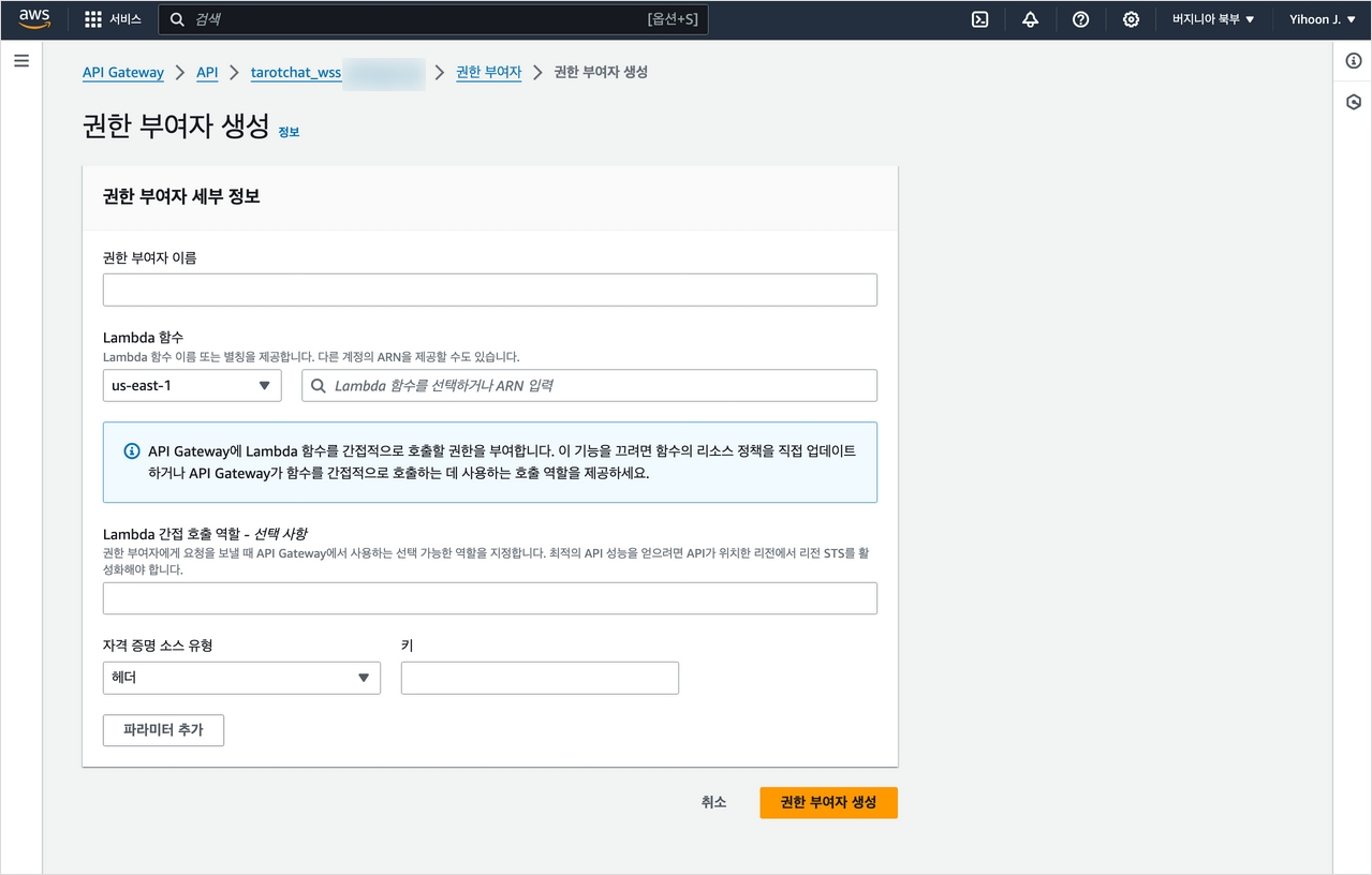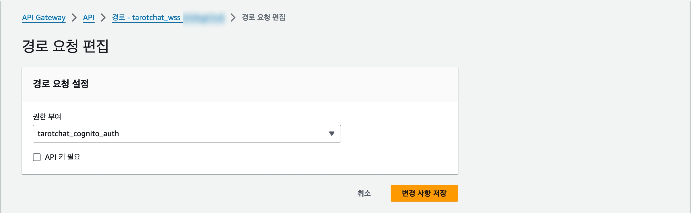 이렇게 만든 함수는 WS API의 권한 부여자로 역할을 하게 된다. 해당 함수를 Cognito Authorizor로 등록하고, 또 Connect 경로의 권한 부여자로도 등록한다.