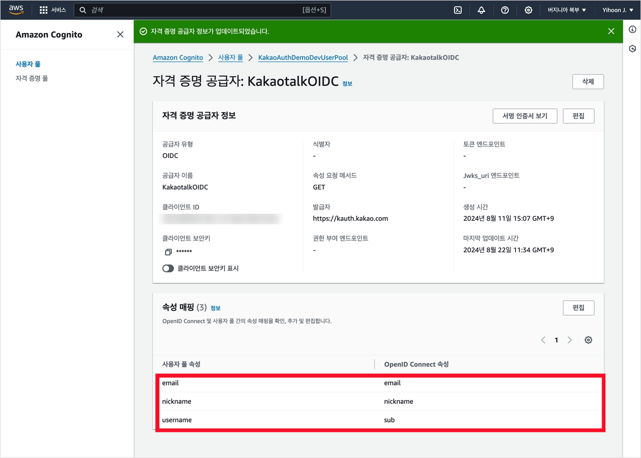 이제 구축된 Cognito User Pool로 이동하자. User Pool의 OIDC 속성 매핑을 변경해 주어야 한다. 사용자 풀 속성 'email'과 'nickname'에 대해 일차하는 OIDC 속성 을 연결한다.