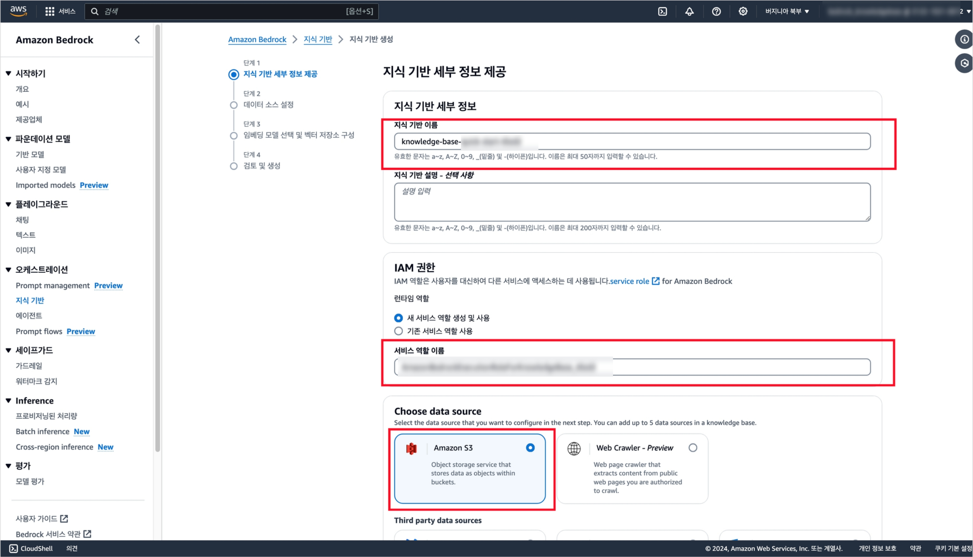먼저 지식기반 이름을 지정하고 새 IAM Role을 생성한다. 또 데이터 소스로는 S3를 선택한다.