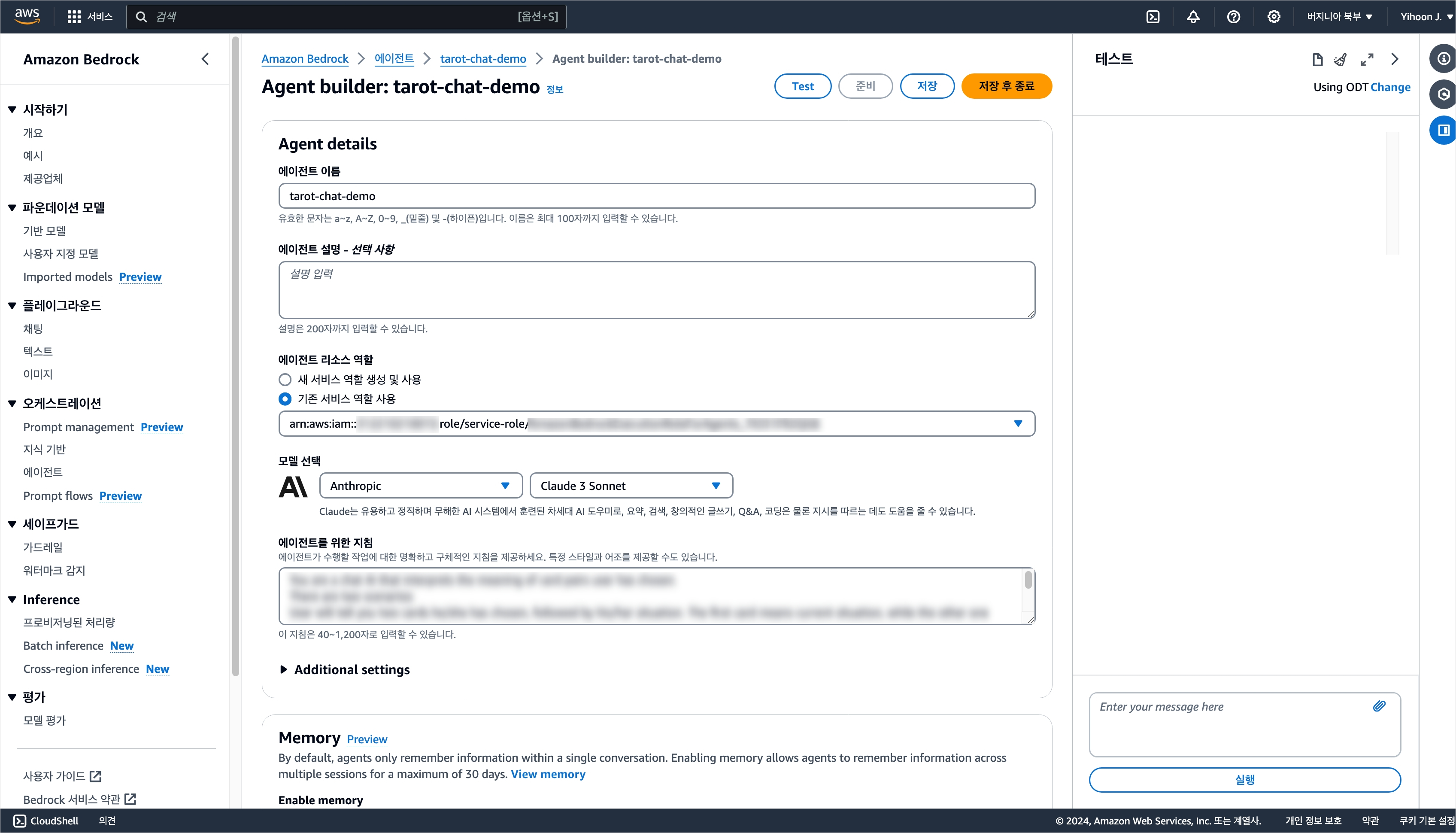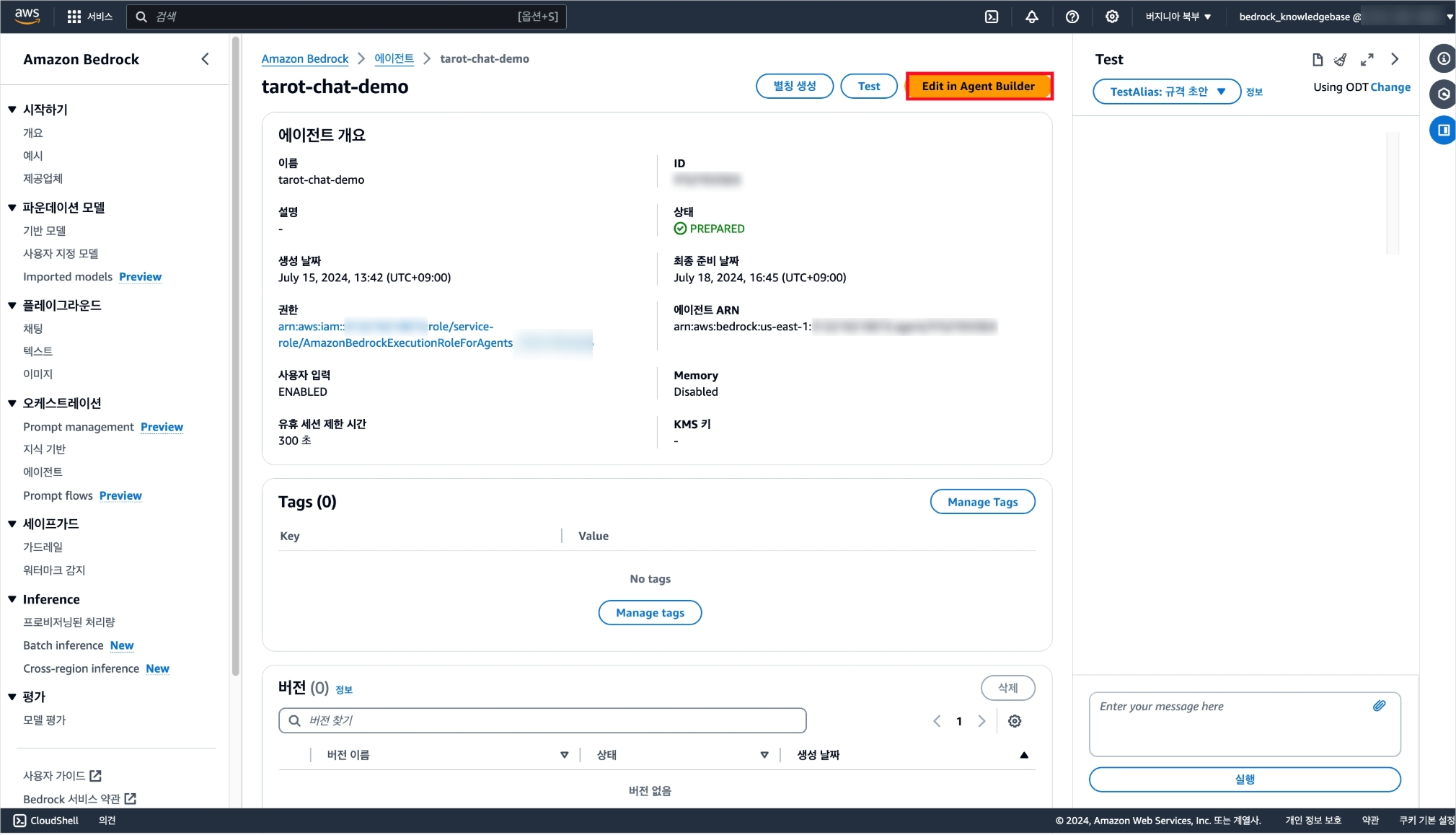지식기반 생성은 루트 계정에서 불가능한 작업으로, 반드시 IAM 계정에서 수행해야 한다. 에이전트에게 상세한 지침을 튜닝하는 것은 함께 프로젝트를 하는 PM이 담당하기에 PM이 사용할 IAM 계정에서 지식기반 생성과 테스트가 가능하도록 아래와 같은 정책들을 부여하였다.