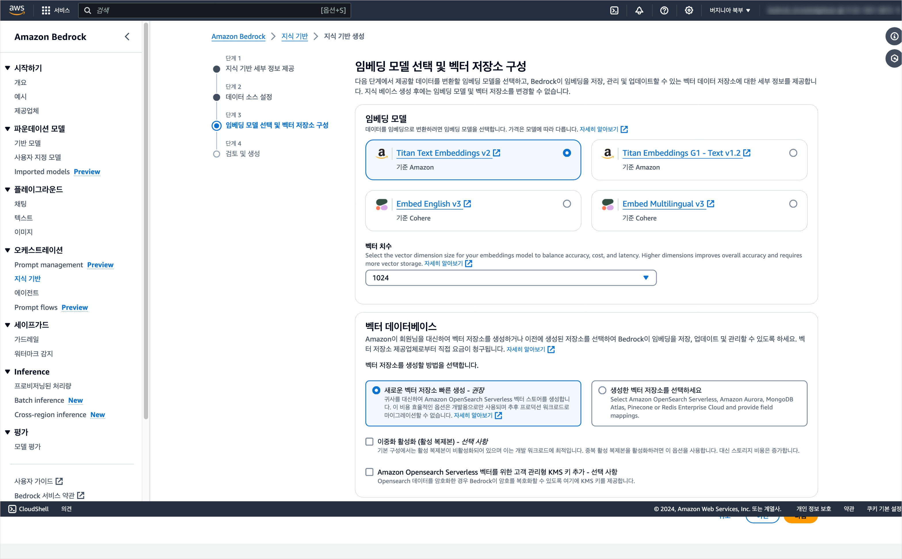 이후 텍스트를 벡터화하기 위해 임베딩 모델을 선택한다. 나의 경우 Titan Text embeddings V2를 사용하였다. 또 벡터 DB의 경우 권장값인 OpenSearch Serverless를 사용하였다.