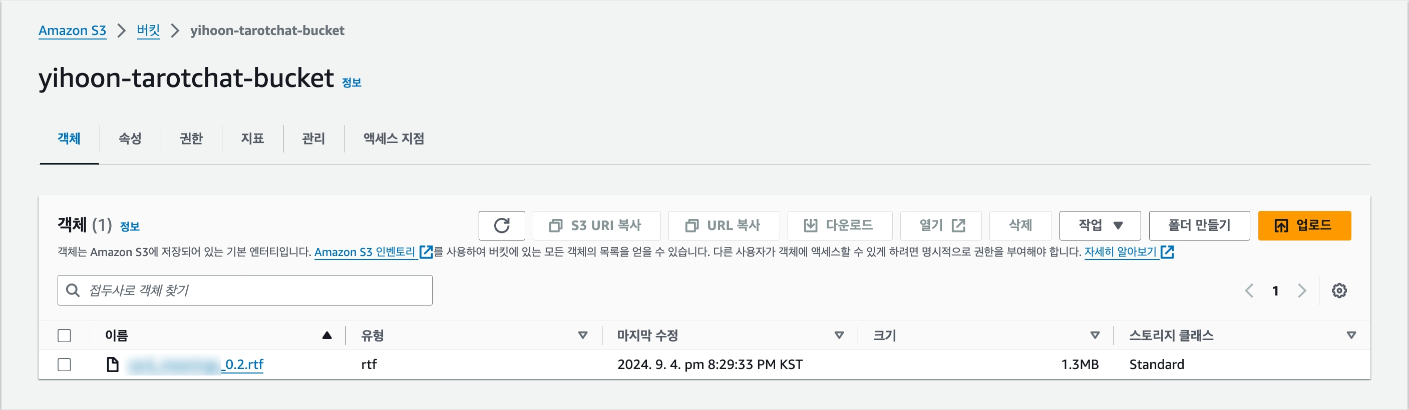 먼저 지식기반이 될 해당 문서를 버킷에 업로드했다. 해당 버킷에 따로 퍼블릭 설정을 해둘 필요는 없다.