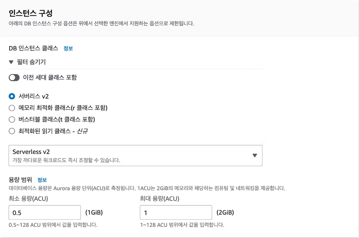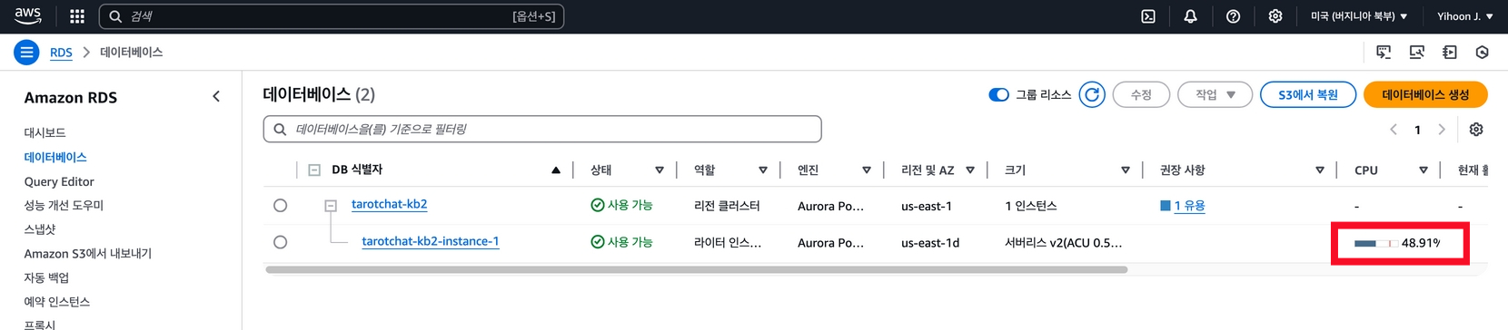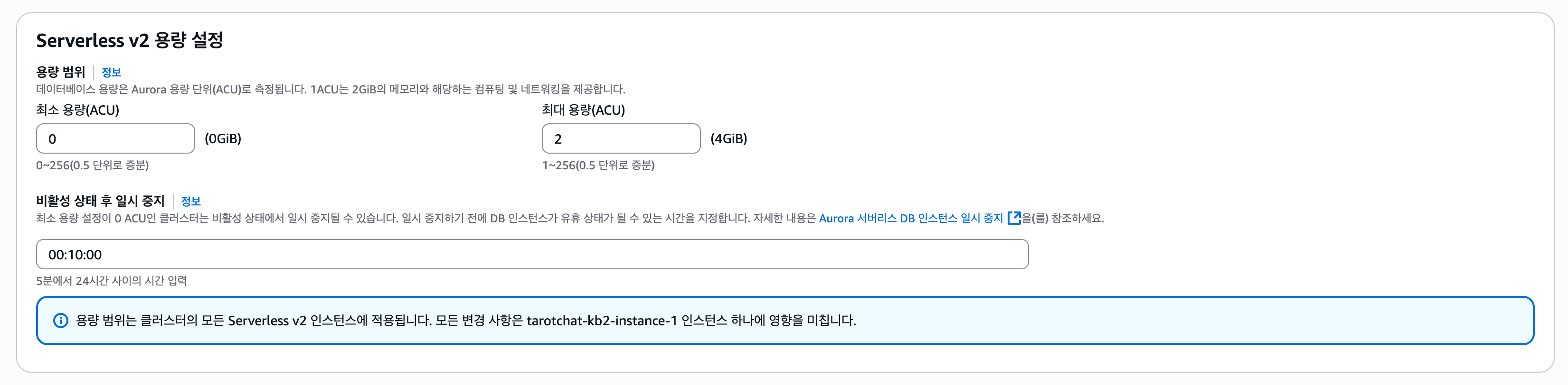 지식 기반 생성 이후 RDS 요금이 다소 부담스러웠다. 작업 당시 사용한 PostgreSQL 15.4 버전은 Serverless V2에서 최소 ACU를 0.5 이하로 설정할 수 없었고, 이 때문인지 항상 CPU 사용량이 상당히 높게 유지되고 있었다