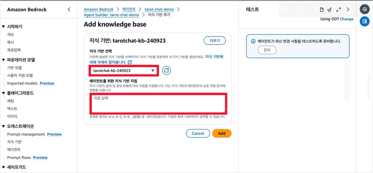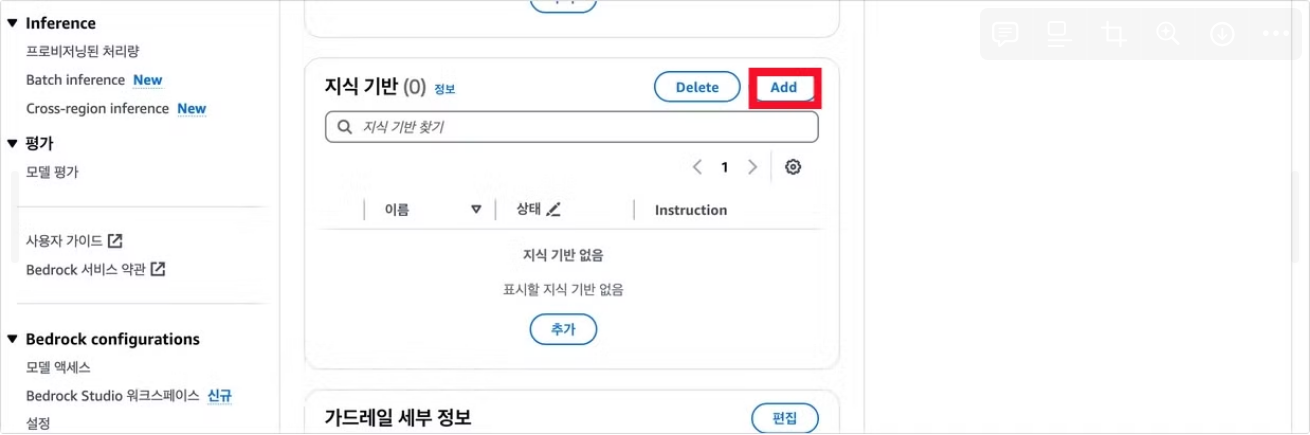 지식 기반 영역에서 Add를 눌러 지식기반 추가 메뉴에 진입할 수 있다. 여기서 만들어 둔 지식 기반을 선택하고 지식 기반 지침을 작성한다.